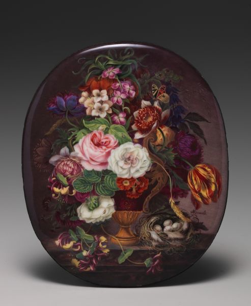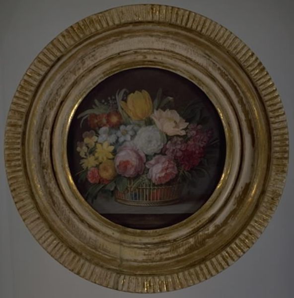 Willem van Leen created this still life with flowers and fruits in the late 18th or early 19th century, using oil paint. The painting presents a carefully arranged assortment of blooms and ripe fruit, set against a dark backdrop, a common convention in Dutch still life painting. The opulence of the scene reflects the prosperity of the Dutch Republic at the time. Such paintings were not merely decorative; they carried symbolic weight. The flowers, each at their peak, hinted at the fleeting nature of beauty and life, a reminder of mortality known as 'vanitas'. Consider that the Dutch art market of this period was thriving, driven by a wealthy merchant class keen to display their affluence and refined taste. Artists like van Leen catered to this demand, producing works that were both aesthetically pleasing and morally instructive. By examining estate inventories, auction records, and other historical documents, we can better understand the place of such paintings in the homes and lives of the Dutch bourgeoisie. Art offers a unique window onto the social and institutional contexts of its creation.