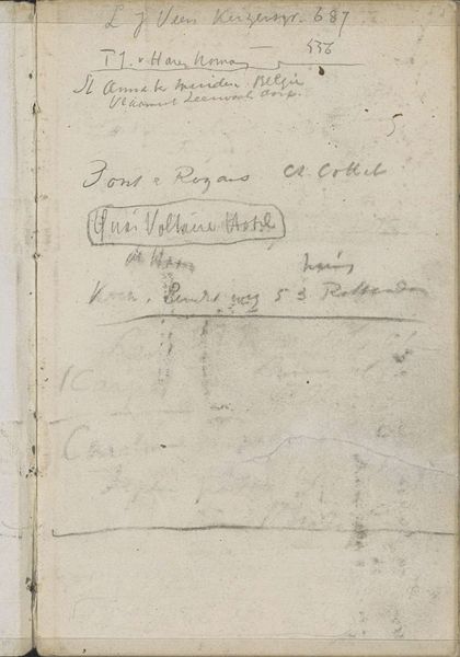 Curator: Here we have "Annotaties," a page of notations, dating from around 1902 to 1914, created by George Hendrik Breitner. It’s ink and coloured pencil on paper, and you can find it here at the Rijksmuseum. Editor: At first glance, I’m struck by its dense texture—the layering of script creates a visual rhythm. It reminds me of someone's private thoughts, barely contained. Curator: Breitner, known for his street scenes and his 'cityscape portraits' of Amsterdam, often used notebooks to jot down ideas, addresses, and expenses. These weren't always intended as finished pieces, but glimpses into his process. Do you see any emerging cultural references within the notation, as I'm particularly fascinated by cultural artifacts. Editor: Indeed, the structure itself tells a story. The way the writing overlays suggests an urgency. Also, notice the ruled lines; they try to contain the scribbles, but the energy spills over. Curator: The visual chaos makes sense if we think of these notations as Breitner attempting to capture ephemeral experiences. The details—addresses, perhaps reminders—serve as anchors connecting the artwork to the pulse of life he observed in Amsterdam. The impression is one of vibrant movement—almost chaotic movement—akin to a visual stream-of-consciousness, no? Editor: Definitely, the formal repetition evokes a kind of urban rhythm that resonates perfectly with Impressionist art; however, the scale adds another dimension. Curator: It offers an unusual contrast; typically, a work on paper prompts associations with sketching—intimate scales where line, composition, and the gesture become paramount. But Breitner pushes it in another direction—offering visual insight into his professional, even day-to-day, concerns, yet simultaneously using ink to express some kind of personal connection with the external world that surrounds him, through text, addresses and other personal concerns. Editor: Absolutely. These "Annotations" demonstrate the emotional charge we often associate with script—perhaps an aesthetic of the unfinished, and, importantly, how it informs, for the modern viewer, the act of its original composition. Curator: And so, perhaps we're left with is a potent testament to the ordinary origins of artistic inspiration. Editor: Precisely, thank you for guiding my appreciation, a fresh way to regard the creative act.