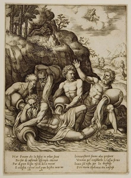 Editor: This is Giulio Bonasone’s "The Entombment of Christ." It's a somber scene, focusing on grief and loss. I'm curious, with your expertise, what symbols or visual cues stand out to you in this work? Curator: Notice the three crosses on the hill in the background. They are more than a geographical marker; they carry centuries of collective memory, representing sacrifice, redemption, but also the immense weight of human suffering. Do you see how Bonasone uses the emotional power of that universally understood image to amplify the scene's gravity? Editor: I hadn't considered the emotional weight of the crosses, but I do now! Thanks! Curator: These layers of symbols provide continuity, connecting us to our shared human experience through visual storytelling. It's a powerful reminder of art's capacity to evoke deep emotion across time.