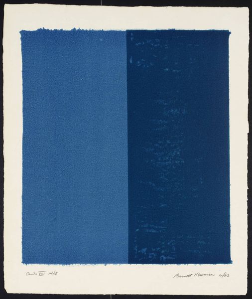 Editor: Here we have Barnett Newman's "Canto VII," created in 1963 using acrylic paint. It’s a print featuring these two bold vertical stripes of blue. There’s something calming, almost meditative, about its simplicity. How do you interpret this work? Curator: Newman, even with what some might see as simple lines, or “zips” as he called them, taps into primal symbolism. What do these vertical stripes evoke for you? Think of the pillars of a temple, the binary code of existence, maybe even standing figures. It is Canto VII from the larger “Cantos” series, so could this reference Ezra Pound? Editor: I can see that… pillars or standing figures for sure! The reference to the pillars in a temple makes a lot of sense. What about Pound's Cantos? Curator: The "Cantos," fragmented and deeply symbolic, seek to capture history and culture in lyrical bursts. Here, perhaps Newman offers a visual parallel, these "zips" acting as fragments of pure experience, moments of stark clarity amidst a sea of chaos, a visual memory. They may appear rigid, geometric but can you detect some imperfections and uneven surfaces? What effect might that have? Editor: Yes, they aren’t perfect lines at all. More like… rough edges! Maybe it's about grounding the spiritual in the real? Curator: Precisely. The texture is a link back to the human hand, isn't it? Newman sought to create art that was immediate, experiential, devoid of the clutter of traditional representation. Through color and form, he tried to touch the sublime, something universal and deeply human. It acts as a symbol of finding order. Editor: That’s fascinating. I’m starting to see beyond just the color and appreciate the symbolic depth he was aiming for. Curator: Indeed, a simple blue field can speak volumes, once we learn to listen to its language. What will you see next time, having this knowledge in mind?