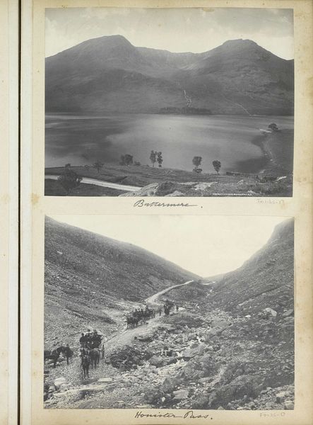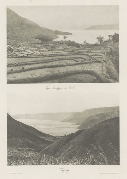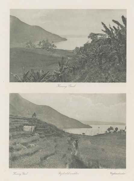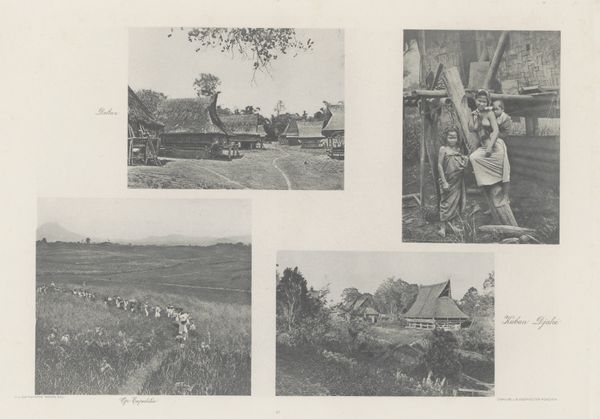 Curator: Welcome. Before us is a gelatin silver print from before 1898 by Carl J. Kleingrothe. The piece is titled "Speelhuis (boven), gezelschap bij boot aan de oever van een water (midden) en passantenhuis (onder) in Harang Gaul op Sumatra.” It's held at the Rijksmuseum. Editor: Gosh, that's a mouthful! Visually, I'm struck by the layered effect—three separate scenes almost stacked, each with a unique mood, but unified by that silvery, dreamy monochrome. The whole thing feels very remote, doesn't it? Like peering into a half-remembered story. Curator: Indeed. The triptych composition invites a comparative analysis. Note the variance in architectural structures from each scene, likely serving distinct societal functions. The upper panel displays a "speelhuis," or playhouse, contrasting sharply with the lower panel's "passantenhuis," a type of traveler's lodge. This contrast indicates different zones within the depicted Sumatran locale and perhaps hierarchical societal divisions. Editor: Hmm, I like that! What I’m also catching is how the light in each scene differs – soft, diffused, almost a haze in the upper and lower scenes, but then a starker light highlighting the figures by the boat in the middle panel. And notice how many boats appear. Are they critical infrastructure? Is this all about transit across the landscape? Curator: The inclusion of these details is important, especially considering that photography like this served a quasi-anthropological purpose at the time. The photographic perspective functions as a kind of gaze, capturing, defining and inherently classifying an existing social reality. How does the photographer, with access to light, position himself in this complex network of signifiers? Editor: Absolutely! Looking at the people now—are they posed, do you think, or is it candid? It feels studied, yet I can't shake the feeling I'm intruding on something intimate. You know, a quiet afternoon by the water... Makes me wonder about their stories. The folks in white outfits especially stick out against the more rustic buildings and watercraft. Curator: Well, by using gelatin silver print, the artist’s indexical process can produce a documentary authenticity. The range of tones captured, particularly the gradation in the landscape, give the composition what we now might even refer to as depth. Editor: A landscape that hints at the depth of human experience as well! Ultimately, it seems more concerned with the people who live within it. A sensitive study, however academic the photographer's intentions may or may not have been! Curator: Precisely. A fascinating piece, and one that demands attention not only to its formal elements, but the deeper currents beneath the surface of the image.