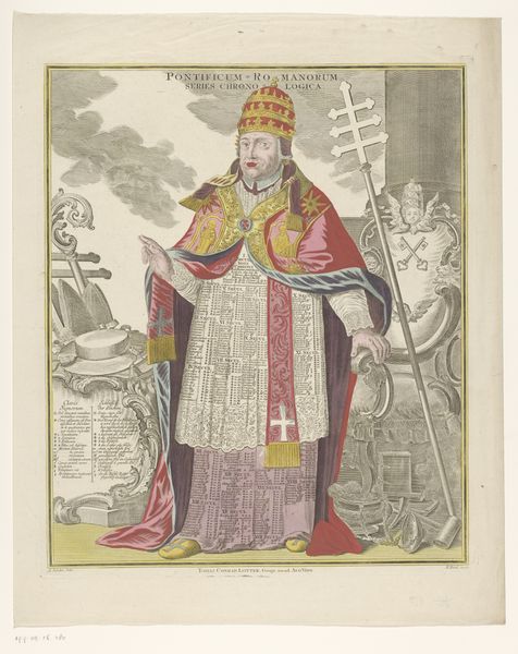 This print, "King with the Names of Kings Throughout History on his Clothing," was created by Emanuel Eichel in the 18th century. During this period, the concept of monarchy was being questioned, giving rise to new ideas about governance and the rights of the people. Here, Eichel presents us with a king adorned with the names of his predecessors, quite literally wearing the weight of history. The garment becomes a tapestry of power, privilege, and perhaps, the burdens of leadership. The king’s identity is interwoven with those who came before him, suggesting that his authority is derived from the past. Does this image celebrate tradition, or critique it? Consider how Eichel uses the visual language of clothing and the body to explore themes of power, identity, and history. Does it reflect the emotional and personal struggles inherent in leadership? Does the king look proud or burdened? This artwork invites us to reflect on our own relationship to history, and the ways in which the past shapes our present.