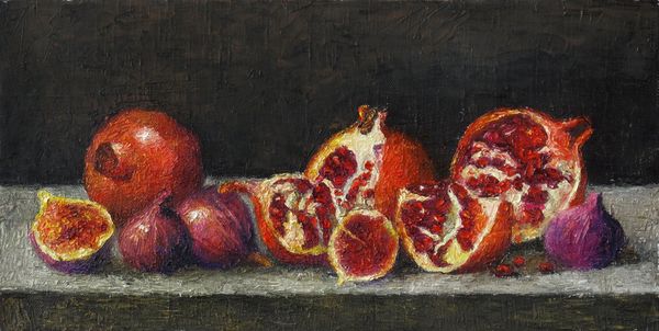Editor: This is “Peaches, Grapes, and Apples,” an oil painting by Severin Roesen. The surface almost appears polished, and the details are quite striking. How would you begin to analyze a work like this? Curator: We must first observe the composition. Note how Roesen arranges the fruit. Do you notice the geometric relationships and how they contribute to the painting’s structure? Consider, for example, the arrangement of spherical forms – the grapes, apples, and especially the peaches. How do their positions relative to each other define the pictorial space? Editor: They do create a sense of depth. The darker grapes in front contrast nicely with the brighter colors of the fruit in the back, layered on top of the draped cloth. What is the importance of color here? Curator: Absolutely. Color plays a pivotal role, creating tonal contrasts that delineate form and enhance the illusion of three-dimensionality. Furthermore, observe how Roesen uses color to distinguish textures: the velvety surfaces of the peaches against the smooth, reflective skins of the grapes. The interplay of light and shadow on these forms adds to the painting’s richness, does it not? Editor: It really does. What would you say Roesen is communicating, with his precise handling of texture and form? Curator: Roesen masterfully constructs an image that is visually pleasing. Every detail seems meticulously placed, emphasizing the tactile qualities of the objects represented. It presents a certain ideal. Through the skillful organization and attention to formal qualities, the painting invites the viewer to contemplate notions of visual harmony. Does this align with your reading of the painting? Editor: Definitely. I initially focused on the painting's realism but seeing how those realistic qualities all work together is an even richer way to appreciate this. Thanks for illuminating the nuances of form and structure. Curator: It's in these structural analyses that we come to see what an artist is trying to say, or show. I enjoyed exploring the work with you.