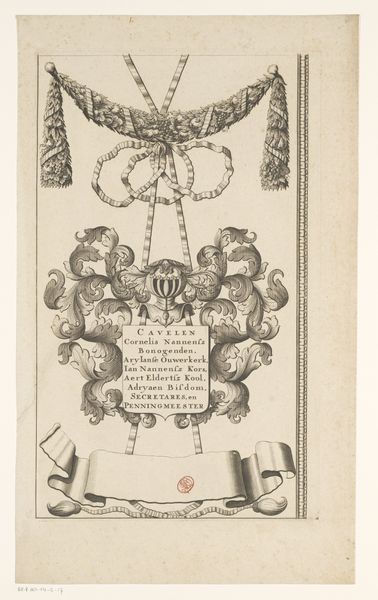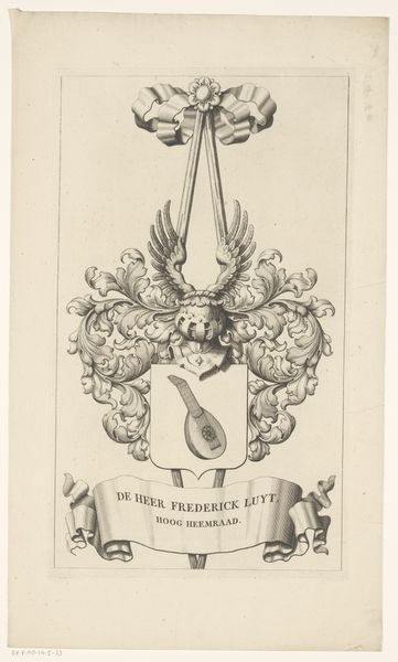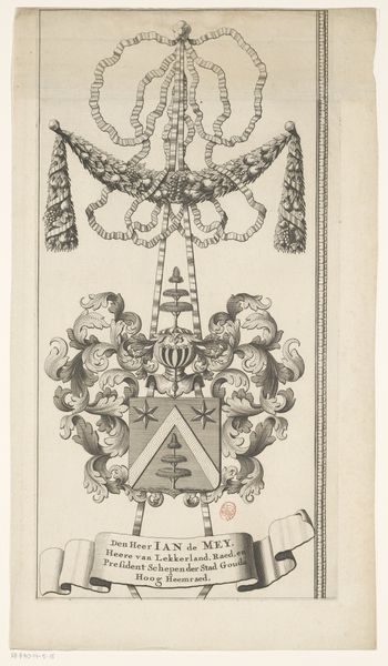 Curator: The detail in this print is astonishing. Created between 1683 and 1741, this particular portion is titled "Kaart van het Hoogheemraadschap van de Krimpenerwaard (deel wapenrand)" which translates to Map of the Krimpenerwaard High Water Authority, specifically, a fragment depicting a heraldic border. It comes to us via David Coster who gave us a rich illustration rendered through engraving. Editor: It’s interesting to see such a traditional, almost ceremonial depiction rendered as a print. I find myself drawn to the materiality of it. It must have taken tremendous skill to create this intricate design with such fidelity to the coat-of-arms tradition through printmaking. Curator: Absolutely. The print situates itself perfectly within Dutch Golden Age aesthetics, an era profoundly shaped by sociopolitical factors and of the emergent merchant class vying for authority within civic infrastructure. Here the Krimpenerwaard, a district known for land reclamation and agriculture is laying claim to itself by showcasing the infrastructure supporting these activities. Editor: What I notice is how this image mediates craft and industrialism. We have a hand-engraved image produced through laborious material practices used to signify and broadcast ideas of authority and infrastructure and that becomes quite revealing regarding power and representation at that time. I am especially interested in the process; imagine the plates that bore this image. How were they composed, printed, used, and what material constraints and conditions produced this particular expression? Curator: Well, to that point, I wonder about the choice to represent a pastoral scene; it feels deliberately old-fashioned, an appropriation, maybe, given the contemporary technologies leveraged in water management at the time. In many ways the Baroque details present here clash with contemporary notions of land as industry. It creates an immediate tension for modern viewers accustomed to landscapes being categorized within aesthetic or even commercial frameworks. Editor: Right, a key part of baroque sensibilities involve ornamentation and opulence. Its placement here creates a curious parallel between the natural elements and the built infrastructure designed to master it. Curator: Exactly! Reflecting on how the High Water Authority employed imagery as both record and propaganda reveals complex ties between art, nature, and politics in 17th and 18th century Dutch society. Editor: Considering this piece, its material origin, how it represents technology through the lens of both land reclamation and print-making leaves one grappling with production, meaning, labor and power dynamics, which provides quite an insight into our present era of post-industrial landscapes.