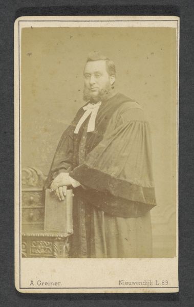 This striking, undated portrait of Willem I, Prince of Orange, is presented in a monochrome print. The composition is dominated by the figure of Willem, his presence accentuated by a rigid, upright posture. Notice how the artist uses a formal arrangement of lines and shapes to convey power. The checkered floor provides a structured base, while the vertical lines of the drapery and Willem's attire lead the eye upward, emphasizing his height and stature. Light and shadow work in contrast, delineating the folds of his garments and the contours of his face, adding depth to the two-dimensional surface. The stark white ruff around his neck serves as a focal point, drawing attention to his face and lending an aristocratic air. The portrait functions as a structured sign, using established visual codes to denote status and authority. It invites us to consider how these formal elements contribute to the construction of identity and power within the historical context.