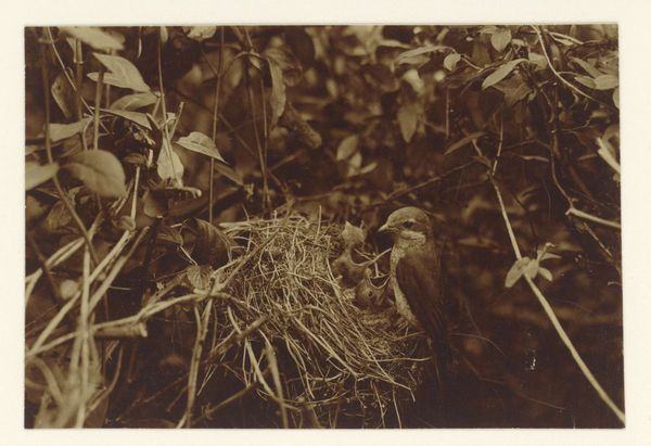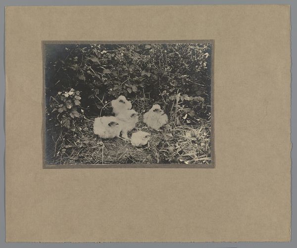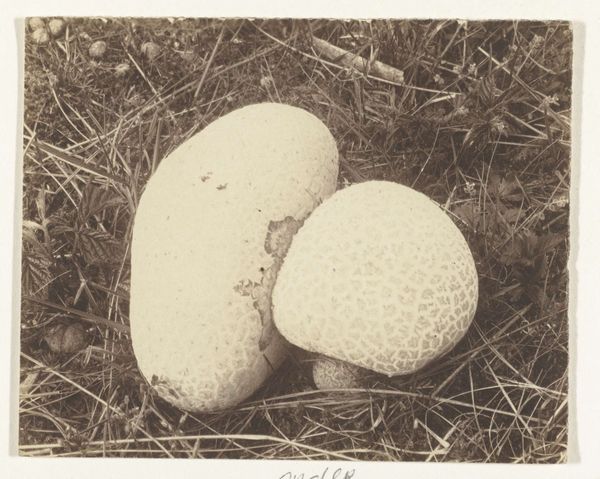 Curator: This fascinating photograph, "Geweizwam en stuifbal (zwammen, paddestoelen)", translates to "Deer Antler Fungus and Puffball (fungi, mushrooms)" and was created by Richard Tepe between 1900 and 1930. Editor: My initial impression is that there's an appealing juxtaposition here: organic forms clustered around this severely truncated stump. It's rather melancholic. Curator: Observe how Tepe has masterfully arranged these fungal specimens within a realistic environment, focusing on their forms, textures, and tonal relationships. Note the contrasting smooth roundness of the puffballs against the coarse texture of the tree stump and the scattered pine needles. Editor: Right, and fungi in art often symbolize decay, mortality, but also rebirth. This pairing is potent: one symbolizes endings, the stump, while the mushrooms embody life springing forth even in death, creating a layered understanding of life cycles. Curator: Indeed, the formal arrangement enhances this tension. The lighting, subdued and diffuse, emphasizes the subtle gradations of tone across the surfaces, lending depth to the composition. There is a careful balance, with visual weight distributed among the three focal points. Editor: It also echoes a kind of visual alchemy, doesn't it? The transformation implicit in both the fungal growth and the decomposition of the stump; there's something quite evocative in presenting that so starkly. In earlier eras, the appearance of unexpected vegetation signaled the presence of elemental forces, which adds to the visual symbolism in nature photography. Curator: And if we consider photography itself as a medium – a process of capturing light and shadow – the image embodies a conceptual interplay between visibility and impermanence. Editor: Precisely! Thinking about Tepe’s composition, and his chosen subject, really deepens one's engagement with this piece. Thank you. Curator: An insightful perspective; considering photography's conceptual qualities adds another layer of meaning.