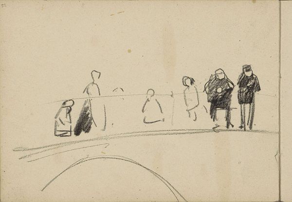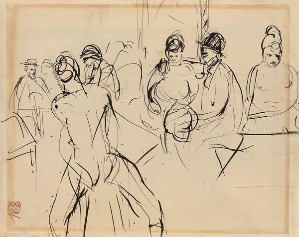 Editor: This is John Singer Sargent's sketch, "Spanish Male Dancer before Six Seated Figures." The rapid brushstrokes give it such a sense of movement, of fleeting energy. What resonates most with you in this composition? Curator: The dancer’s form evokes a powerful, almost primal energy. Notice how Sargent captures the essence of the performance not just through the figure, but through the gaze of the seated figures. What memories or cultural narratives do you think Sargent aimed to capture with this scene? Editor: Perhaps the passionate culture of Spanish dance? I hadn't considered the symbolic weight of the audience, though. Curator: Precisely. Sargent’s work often investigates the exchange between performer and audience, observer and observed. This interplay reveals much about cultural identity and the power dynamics inherent in such interactions. Editor: That's fascinating! I'll definitely look at Sargent's work with a new perspective now.