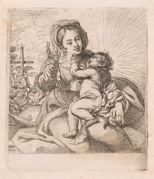 Editor: Here we have "Holy Family with John the Baptist" by Cornelis Schut, an etching from between 1618 and 1655. The stark lines and the close grouping of the figures create a really intimate feel, even though the style is quite detailed. What do you see in this piece, particularly in terms of its formal qualities? Curator: I am struck by the composition. Schut employs a pyramidal structure, with the figures arranged to guide the eye upward. Note how the dense network of lines in the foreground contrasts with the lighter touch used for the figures in the background, creating depth. The artist’s deployment of hatching and cross-hatching seems meticulously planned. Observe how each contour, each modulation of light and shadow, contributes to the overall visual texture. Editor: The way the light falls does seem really intentional. Almost like a spotlight. Does that emphasis impact the form significantly, would you say? Curator: Precisely. The illumination serves to highlight specific forms, emphasizing the tactile quality of the figures, whilst drawing focus on their relationships. What do you think that selective lighting achieves in terms of the expressive qualities of the piece? Editor: I think it creates a dramatic tension; not as much drama as tenebrism, but maybe hints at the baroque movement somehow. Curator: An astute observation. And does the intricacy of the lines impact your appreciation? Editor: Definitely, I am really captivated by it, how with a medium such as this the artwork retains such powerful character and narrative, making use of such stark lines to create volume and presence! Curator: Indeed! Reflecting on it further, I’d observe that the balance achieved between the detailed rendering and overall composition marks Schut as a truly capable etcher. Thank you, that brought a different appreciation to me. Editor: Thank you too!