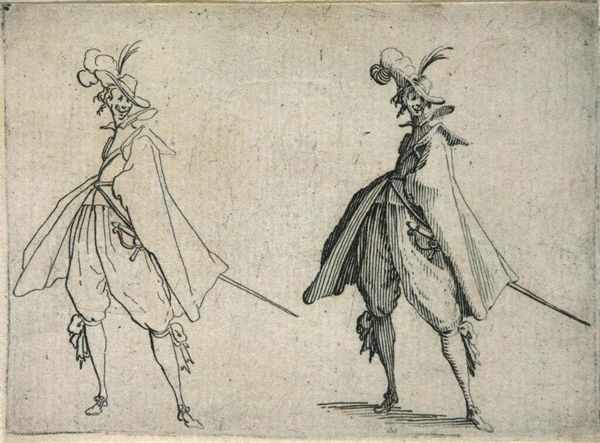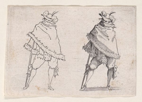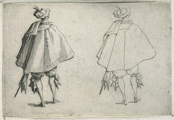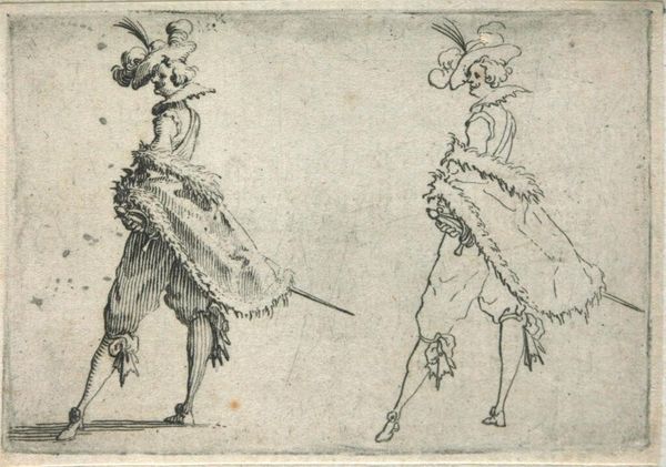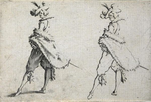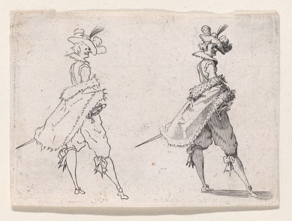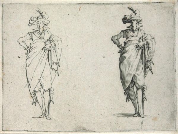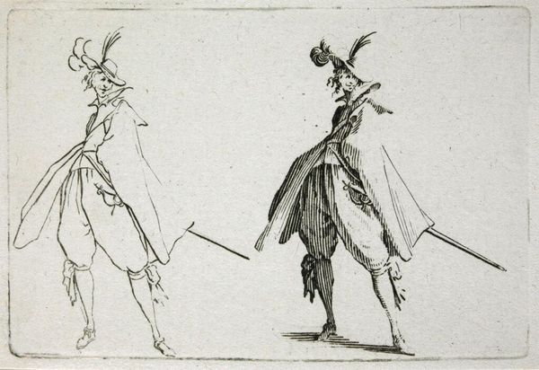 Editor: Here we have "Copy of Le Gentilhomme au Grand Manteau," a baroque etching dating sometime between 1620 and 1700, held here at the Met. The gentleman looks theatrical, but there's also a flatness to the image due to the printmaking. I wonder, what stories does this etching tell us about its time? Curator: It's fascinating how you pick up on that theatricality. Etchings like this, especially within series like "Les Caprices," weren’t just portraits; they were powerful tools for disseminating imagery and ideals. Consider the gentleman's elaborate attire. What does it tell us about social status and the intended audience for such prints? Editor: I see your point. It’s obviously meant for those who can appreciate—and afford— such fine clothing. Is it a way of displaying the socio-economic structures? Curator: Exactly. Prints allowed for a wider distribution of images previously limited to the wealthy. By understanding who was buying and circulating these images, we get insights into shifting social dynamics, emerging middle classes and the aspiration to embody courtly ideals. Does that make you think of the modern context of image dissemination? Editor: It definitely does. Think of social media and how people try to present themselves in an ideal form. But I am curious, why are there two of him? What did the original artwork this copy come from suggest? Curator: That doubling effect in this particular image enhances the performative aspect, perhaps poking fun at the affectations of nobility or simply showcasing variations in dress and style. Analyzing the "Caprices" series, one would be able to unravel specific socio-political commentary from the artist. These are pieces circulated among the elite as much as they were used as currency amongst merchants, scholars, and artists to disseminate these images in broader contexts, and to make them accessible to broader audiences than simply elite classes. Editor: That is insightful. Seeing the cultural relevance of the print medium and the social commentary that they provide reshapes how I see not just this piece, but portraiture of the era more broadly. Curator: Precisely! Now consider how museums, like the Met, play a role in shaping our understanding of these historical dialogues by preserving and presenting them.