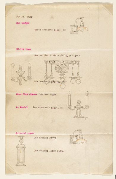 This is a page of a proposal for lighting fixtures made by John S. Bradstreet and Company, probably in 1911. The drawing uses a spare line, the kind of line you might get from a technical drawing, or the page of a notebook. It's really interesting to see the way these objects are rendered in a utilitarian style in contrast with the implied opulence of the objects themselves. The drawing shows ceiling lights and sconces, with curlicues and delicate lines. The words "Living room" and "Porch" are written in purple ink as if from a typewriter, the pricing marked next to each item. The whole thing has a very ghostly, ephemeral feel, the light almost radiating off the page through the network of lines. Artmaking is often like this, a conversation with the past, where we borrow and build upon ideas. Think of how David Hockney played with perspective and line, or how other artists have explored interior spaces and the play of light within them. It's never really about fixed meanings but more about the way it makes you feel.