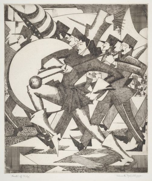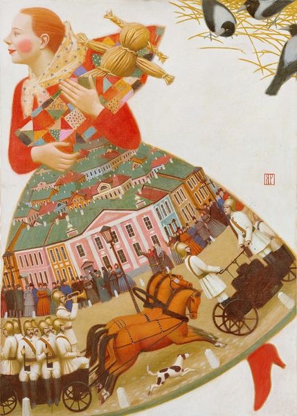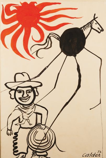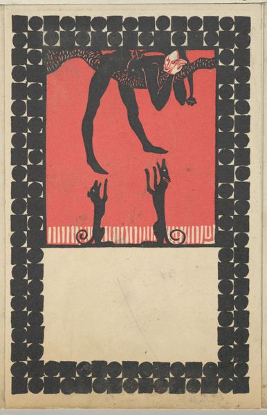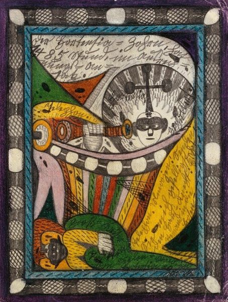 Editor: This is listed as "Caricature of Professor M. Boichuk" and is believed to be by Mykhailo Boychuk, we don't know exactly when it was painted, or with what materials. I get the impression it’s rather satirical. What’s your take on it? Curator: It’s fantastically wicked, isn’t it? And ever so slightly unhinged. The image seethes with, I want to say, revolutionary fervor— the orange palette pulsates, but there’s a sort of stylized violence playing out above Boychuk himself, who looks saintly in profile. A sort of double vision… do you see it too? Editor: Absolutely, there’s this odd combination of reverence and mockery going on! The “saintly” portrayal of Boychuk below definitely clashes with the chaotic scene above. Curator: Indeed! That figure looming above... he is like some demonized reaper holding up his tools. Are they sickles? And he’s sitting on... another prostrate body? There's also this ghost hovering above! It makes you wonder, what's Boychuk being caricatured for? His ideas? His methods? Or is there something much more personal bubbling to the surface here? Editor: It's complex. The contrast between the placid Boychuk and that scene of frenzied labour—maybe forced labour—it hints at societal pressures and personal struggles clashing. I wonder if that expressionism makes it a darker caricature of productivity under duress. Curator: Beautifully put. Perhaps that's the core tension. The saint and the sinner are within all of us, no? That struggle to remain grounded when external forces threaten to twist you. That constant search for freedom when it is all taken away... Editor: It definitely provides much more than just a humorous glance; more of an introspective viewing now. Thank you. Curator: The pleasure's all mine, to get to dance with images is always such fun.