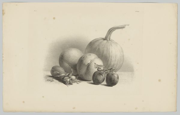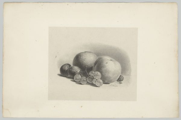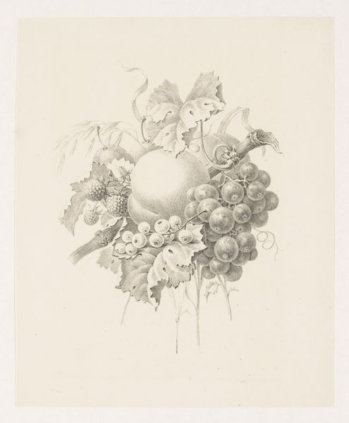 Editor: Here we have "Grapes and Apples," a pencil drawing from between 1820 and 1833, currently housed at the Rijksmuseum. What strikes me most is the realism and the muted palette; it feels like a captured moment, quiet and unassuming. What's your take? Curator: It is deceptively simple, isn't it? These types of still lifes were often commissioned by wealthy patrons for display in their dining rooms or kitchens. How does this artwork operate within the context of 19th century Dutch society and what are the messages being conveyed beyond just visual representation? Editor: Hmm, beyond just showing some fruit? Well, maybe it’s about wealth or status if it was for rich people, or perhaps a moral message about the bounty of nature? Curator: Exactly. Still lifes were vehicles for displaying wealth, certainly, but also for moralizing. Consider the subtle inclusion of possibly overripe or slightly decaying fruit. How might that influence our understanding of the drawing as something beyond mere decoration? Editor: That's interesting; maybe a reflection on mortality, that everything, even beauty and bounty, fades? How would the average person back then see something like that? Curator: The average person likely wouldn't have had access to such art, reinforcing its connection to power and privilege. It's a poignant reminder that art, even a simple still life, operates within and reinforces existing social structures. It’s also useful to examine the role institutions like the Rijksmuseum play in defining which artworks get seen and remembered today. Editor: So, the fruit isn't just fruit. I guess understanding the audience changes everything. I’ll never look at a still life the same way again. Curator: Precisely. And it's a constant negotiation between what the artist intended, how it was initially received, and how we interpret it today. We've barely scratched the surface!