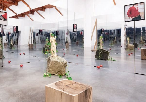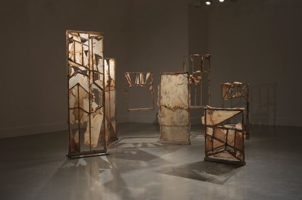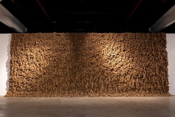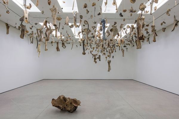 Anselm Kiefer's "Palm Sunday" is a large-scale installation that confronts us with themes of destruction and renewal through its composition and form. Arrayed in a grid, the paintings on the wall create a dialogue with the decaying palm tree which is lying on the floor. The paintings feature muted colors and distressed textures, invoking a sense of decay and history, like faded memories or archaeological finds. The installation's structure emphasizes its thematic concerns. The grid-like arrangement of the panels suggests a system, a way of organizing chaos, yet the variations within each panel disrupt any sense of total order. Similarly, the fallen palm embodies death but also hints at the possibility of rebirth. Kiefer here uses the semiotics of decay and growth to question fixed meanings and linear narratives. The formal qualities of "Palm Sunday"—its scale, texture, and composition—function not merely as aesthetic devices but as elements in a discourse about time, history, and the cyclical nature of existence. The artwork invites endless interpretations by engaging with cultural memory and philosophical reflection.