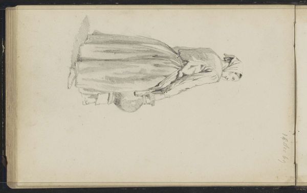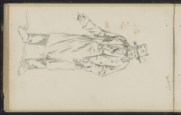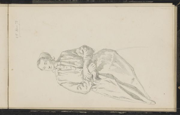 Editor: This is "Jongen, op de rug gezien" – "Boy, seen from the back" – a pencil drawing by Cornelis Springer from around 1870, here at the Rijksmuseum. The immediate thing that strikes me is its incredible lightness, and how quickly it seems to have been executed, like a snapshot. What stands out to you, looking at the formal qualities of the work? Curator: Precisely that, the seemingly effortless capturing of form. Observe the economical use of line – how Springer defines the boy's figure with a confident brevity. Consider the varying pressure of the pencil, creating subtle tonal shifts that model the volume of the clothing and body. Note especially how the hatching suggests form and shadow with minimal means. Does the orientation strike you in any particular way? Editor: It's unusual, yes. He's lying horizontally in the frame, which emphasizes the horizontality of his pose and the recumbent nature of the drawing. Does that flattened perspective hint at anything in particular? Curator: It could, through its unusual arrangement, disrupt the usual verticality of a standing or seated portrait. How the artist has consciously constructed the image through the use of visual grammar and pictorial syntax is telling. Are there obvious contrasts here? Editor: The contrast of light and dark. Where his shirt bunches up, or under his chin, are where the heaviest marks are. Also the texture of the boy's hair gives darker marks on top of the smooth expanse of toned paper. Curator: Indeed. And consider how the composition directs the viewer's eye. Does the gaze linger anywhere? Editor: On the folds of the shirt and the roundness of his head. I see how the artist uses the absence of detail in certain areas to draw attention to others. I never really thought about sketches in that way, of using tonal variations like emphasizing phrases. Curator: Absolutely. It's in that intentional interplay of line, tone, and form that the expressive power resides. Every mark carries meaning. Editor: Thank you, that emphasis on visual structure helps me look past subject matter. Curator: You're welcome; concentrating on structure and form enhances our aesthetic experiences.
