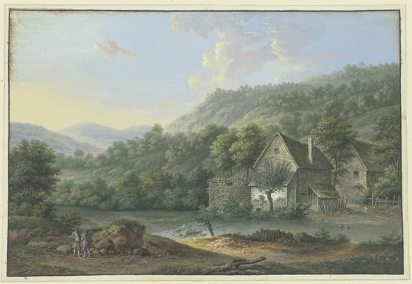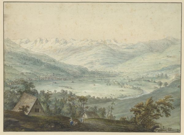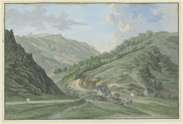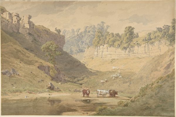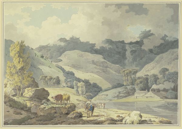 Karl Franz Kraul composed this landscape drawing with delicate colour washes. Notice how Kraul arranges the elements—mountains, a waterfall, figures, and animals—to guide our gaze. The foreground presents us with pastoral tranquility. A gentle stream, grazing cattle, and a figure on horseback create a sense of immediate calm. However, as we move into the midground, a path leads toward a distant, almost ethereal waterfall, partially obscured by clouds, prompting a deeper reflection. The drawing's structure invites us into a visual journey. Light and shadow play across the mountains, creating depth and a sense of the sublime. This use of light, typical of Romantic landscape painting, evokes a sense of awe and the insignificance of humanity in the face of nature. Consider how Kraul uses composition to evoke not just a scene but a dialogue between the immediate and the infinite. The drawing encourages us to consider our place within a grand, natural order, a reflection of the period’s broader philosophical inquiries into nature and existence.