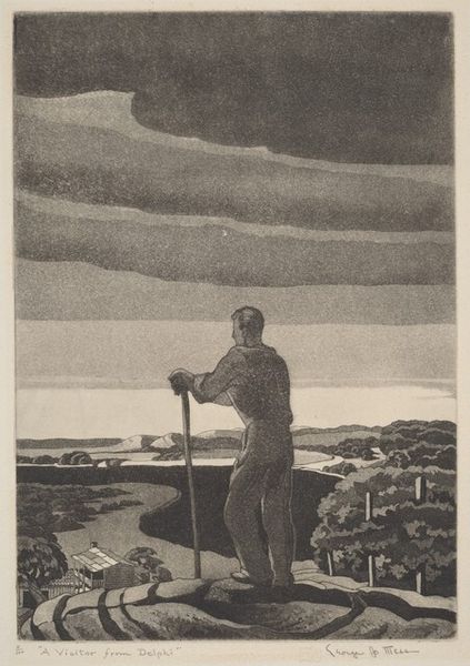 Curator: Looking at Leon Gilmour’s intaglio print, "Let the Living Rise," made in 1937, one sees immediately how Gilmour masterfully balances Social Realism with an abstract style. The scene depicts a solitary figure in the foreground looking up towards planes and a vortex. Editor: My initial thought is—this feels unsettling, like witnessing a prophecy. The monochrome palette heightens the drama, casting long shadows that seem to reach out of the artwork. The swirling lines above make me feel kind of queasy, like an impending storm front, and, ugh, there are warplanes. Curator: Indeed, the monochromatic approach lends a stark, decisive tone, enhancing the gravity of the subject. The intaglio method, where the image is etched into a plate, adds depth, highlighting texture and tone which contributes significantly to the symbolic language. The lone figure carries multiple meanings here, it could symbolize humanity itself. His hand, outstretched, almost evokes a sense of hopeful beckoning toward progress but also conveys helplessness, fear in the face of aerial bombardment. Editor: Right? Hopeful but with the hand raised almost to shield him. And that turbulent sky is doing *things* to me; those lines could just as easily be water, a massive wave overtaking the city down below... is that destruction and chaos or hope, guidance he sees up there? It’s almost a mirror of both emotions clashing, fighting it out on this tiny sheet. It kind of has a fun, bleak perspective about social awareness that, honestly, hits harder than a full color piece would have! Curator: Well put. I think the tension lies exactly in the contrast Gilmour creates. It does invite, and even demand introspection from viewers, who get prompted to ponder not just what the present holds, but, equally, what the future demands of us as the heirs and inheritors of humanity. The figure is then perhaps everyman: ourselves. Editor: It's strangely reassuring, in a bleak way, that these concerns have echoed throughout history, and that artists like Gilmour have used art to explore them. Curator: Ultimately, Gilmour urges a crucial dialogue: what should we fight for? How shall we rise above impending catastrophe? A prescient and resonant piece for us all.