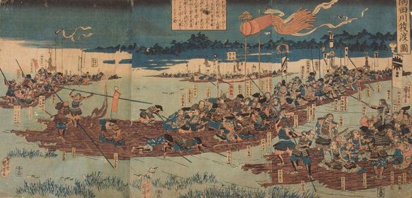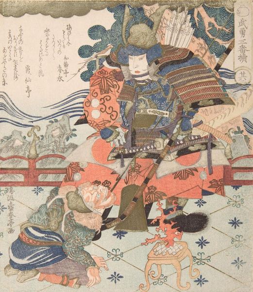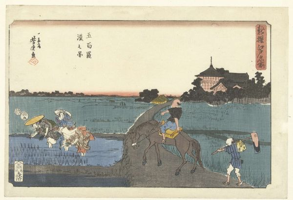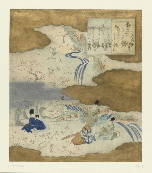 Editor: This woodblock print, "Abe no Nakamaro looking at the Moon," by Katsushika Hokusai, dated between 1833 and 1837, evokes a sense of serene melancholy. The color palette is striking in its juxtaposition of pale yellows and blues with the somber tonality. What draws your eye in this composition? Curator: Initially, the triadic relationship between the primary figure, the moon, and the boat establish a focal arrangement for visual consumption. Observe how the planes create depth despite being a print. The subtle shifts in coloration, particularly the gradation of blues in the water, create a serene spaciousness. What structural components do you observe? Editor: Well, the grouping of the figures in the foreground balances the open space of the water and sky. The roof in the very bottom left corner mirrors the slope of the shoreline across the water. Curator: Precisely. The horizontal bands, divided into thirds—foreground, water, and sky— are visually stabilized through vertical counterpoints such as the figures and trees. Hokusai deftly uses these strategies to create balance and movement in a seemingly simple composition. Have you considered the role of negative space here? Editor: Yes! It highlights the shapes of the main figure. The poem written on the top right, is that an element that can be included within the work's composition as well? Curator: Certainly. The text adds another dimension through line and form; the materiality creates another focal point beyond representation. It enhances the planar arrangement and reinforces a structural cohesion between text and visual motif, unifying the diverse elements. Editor: I appreciate how analyzing the relationships between formal elements opens up so much more meaning within the work. It moves beyond just surface level! Curator: Indeed, considering the piece's formal attributes illuminates the artist's calculated execution.