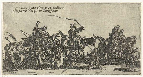 Curator: This is Jacques Callot's etching, "The Bohemians: The Departure," from the early 17th century, currently residing in the Harvard Art Museums. Editor: There's a chaotic energy here, a sense of a whole community on the move. The strong diagonal composition pulls the eye to the right. Curator: Indeed, Callot captures the Roma people, then often called "Bohemians," a term laden with misrepresentations and prejudice. This work highlights the vulnerable position of the traveling communities. Editor: The line work is quite intricate, each figure rendered with distinct detail. What strikes me, too, is the contrast between the figures on foot and those riding in the carts, creating visual layers and adding to the feeling of disarray. Curator: Absolutely. The print is a powerful visual document of the social landscape of its time, raising questions about identity, marginalization, and freedom of movement. It invites us to reflect on the historical context surrounding the Roma and the stereotypes they faced. Editor: Seeing how Callot employed line and form certainly enhances one's appreciation of its deeper meanings. It gives insight to how effective technique amplifies an artwork's message.
