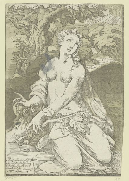 Lucas Vorsterman II created this small engraving, "Portret van een onbekende vrouw met waaier," a portrait of an unknown woman with a fan. The composition is dominated by the figure of the woman, whose nudity contrasts with the floral wreath adorning her head and the patterned fabric draped across her lap and shoulder. This contrast creates a tension between vulnerability and adornment. Vorsterman's technical skill is evident in the delicate hatching that models the woman's form and suggests a soft, diffused light. The background, rendered in dense, dark lines, pushes the figure forward, emphasizing her presence. The engraving medium itself, with its linear precision, allows Vorsterman to explore ideas of representation and idealization. The woman's gaze, directed slightly off to the side, invites the viewer into a dialogue. The work uses visual elements to challenge fixed meanings, inviting ongoing interpretation about beauty, representation, and the cultural codes embedded within portraiture.