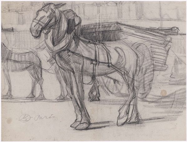 Here is a pencil drawing of a horse, or perhaps a donkey, by Théodore Géricault, who lived from 1791 to 1824. Géricault was deeply affected by the societal unrest and aftermath of the French Revolution and Napoleonic eras. In this context, his sketches of horses offer a glimpse into the relationship between humans and animals. The subdued and humble depiction of the animal could reflect a broader commentary on labor, class, and the socio-economic structures of the time. Is Géricault suggesting the nobility of labor, or is he commenting on the burdens placed on the working class? The drawing is unfinished, lending it a sense of vulnerability and immediacy. The horse bears its saddle, ready for work. The sketch invites us to contemplate the physical and emotional life of working animals and to think about the social hierarchies that define their existence.