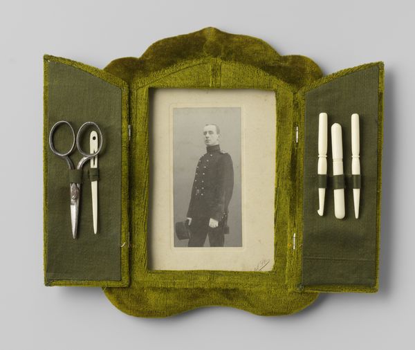 This photograph of an unknown woman by Paul Beuscher is presented within a striking case of velvet, a material once synonymous with luxury. The very texture invites touch, promising a softness that hints at the sitter's own gentility. But let's consider the velvet itself, a textile achieved through a labor-intensive process involving specialized looms. Its deep pile results from weaving extra sets of threads, which are then cut to create the dense, even surface. The production of velvet was a skilled practice, often associated with specific regions and workshops. The introduction of power looms in the 19th century, though, would have gradually democratized its availability, subtly shifting its social status. The choice of such a material for a photographic portrait—a relatively new medium at the time—speaks to the desire to elevate the image, blurring the boundaries between the industrial and handmade, the personal and the presentational. Ultimately, this work challenges us to consider how materials and making processes can imbue an object with layers of cultural meaning.