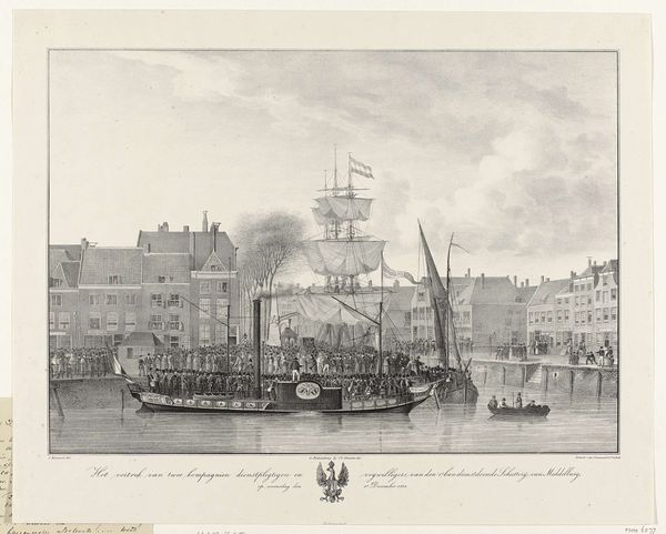 Editor: Here we have A. Verkerk's watercolor and print work, "Koophandel en Zeevaart, decoratie op de Nieuwmarkt, 1795." The monument to trade and seafaring, complete with a ship on top, seems to stand in contrast to the delicate, almost faded quality of the watercolor medium. What can you tell me about the piece? Curator: Let's consider the historical context. 1795 was a pivotal year. Note the flags—the French tricolor alongside the Dutch flag, suggesting the Batavian Republic. Verkerk’s choice of print and watercolor, relatively accessible materials, democratizes the imagery. This isn't an oil painting for the elite, but a potentially reproducible image celebrating commerce within a new political order. Editor: So, the materials themselves speak to a changing society? Curator: Precisely! Think about the labour involved. Printmaking allowed for widespread dissemination of this message. Watercolor, though often associated with amateur artists, enabled the swift creation of many similar images, think of mass production principles being applied. The materiality mirrors the aspiration of accessible trade and new political ideas being ‘consumed’ by a wider populace. Does that make sense? Editor: It does! The work seems to be self-aware in its design, like it uses these more common materials on purpose, to celebrate those new ideals and reflect a changing society. I appreciate learning that this print reflects an early attempt to promote the widespread accessibility of new economic and political ideas! Curator: Indeed! It is the materiality of art and its role in cultural consumption.