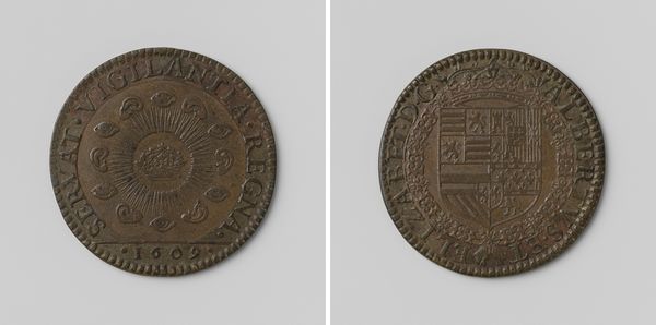 This is a Gelderse duit, minted in 1703 by the province of Gelderland. Coins like this offer insight into the economic and political landscape of the Dutch Republic during the early 18th century. The text on the coin, "D. GELRIA. 1703," refers to the Duchy of Gelderland, a province of the Dutch Republic. Minting coins was a symbol of sovereignty, reflecting the province's autonomy within the Republic's decentralized structure. This coin would have facilitated trade and commerce within Gelderland and beyond. As historians, studying such objects involves delving into archives, economic records, and numismatic studies to understand the coin's value, circulation, and impact on daily life. Coins like this serve as tangible links to the past, connecting us to the economic realities and political structures of the 18th-century Dutch Republic. They remind us that art and economics are always intertwined.