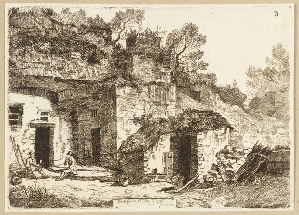 Editor: This is "Boerderij," a farmhouse etching, created sometime between 1780 and 1900 by the monogrammist ADL. There's such a stark, everyday quality to it; almost brutally so. What jumps out at you? Curator: Ah, yes, stark realism, a quality I admire. Look closely. Do you see how the artist hasn’t romanticized the rural scene? The etching captures a very humble abode, slightly disheveled, but very human. There's a directness; not prettified, yet quietly beautiful. How does it make you feel? Editor: It feels lived-in, but also slightly melancholic, I think. The texture, achieved through the etching technique, gives a weathered impression. Is that common for landscapes of this era? Curator: Landscape etchings became increasingly popular, appealing to a wider audience beyond just the elite. Etching allowed for detailed and reproducible imagery, which made it accessible to people wanting a little piece of the countryside. In this specific artwork, consider the light, or the absence of it; everything is evenly rendered. Editor: I noticed that—the even light! It gives it a sense of documentation. I am wondering if that says something about the artist’s intent? Curator: Perhaps. I think that artists like ADL were really trying to capture the everyday experiences. In those moments they were seeking authenticity. Don’t you agree that there's beauty in witnessing something simply for what it is? Editor: I see what you mean. I guess it’s a little snapshot, immortalized in ink. It definitely brings the 18th-century Dutch countryside to life for me. Thanks for pointing that out! Curator: Exactly! A dialogue across centuries, initiated by a simple line, immortalized in ink! Beautiful, isn't it?