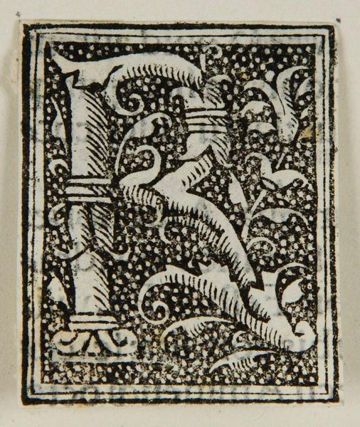 Editor: This intriguing "Initial R" by an anonymous artist in the Harvard Art Museums presents a scene within the letterform itself. The stark contrast and intricate detail is impressive. What do you see in this piece, particularly in terms of its formal elements? Curator: The composition is structured around the stark contrast of positive and negative space, a binary that emphasizes form. The figure nestled within the "R" introduces a figurative element that disrupts the geometric purity, yet the lack of modeling reduces the figures to patterns. How do these visual tensions inform your interpretation? Editor: It appears that the interplay between recognizable figures and abstract design heightens the visual complexity. Curator: Indeed. Ultimately, it is the surface and structural relationships that provide a rich aesthetic experience. Editor: I see it now; thanks for clarifying!