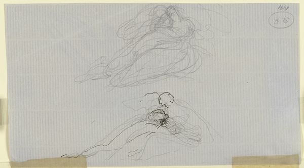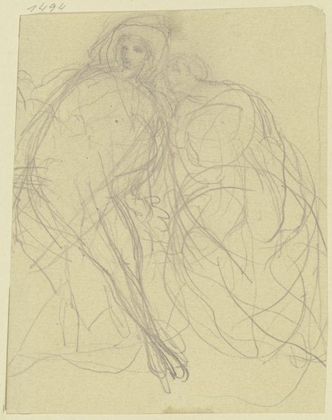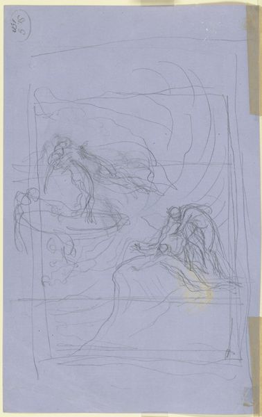 Editor: So, this is Victor Müller's "Romeo and Juliet," a drawing in ink on paper from around 1869 to 1871. The figures are so ephemeral, like a fleeting dream. How do you read this work? Curator: Initially, I'm drawn to the dynamism created by the artist's use of line. Observe how Müller employs varying densities and directions of line to suggest form and movement. What visual effect do you think this achieves? Editor: It makes it feel really active, almost unfinished, like a snapshot of a feeling rather than a solid thing. Curator: Precisely. The sketch-like quality and layering of lines negate any sense of fixed reality, aligning perfectly with Romanticism's interest in the subjective and the transient. We see not so much a representation of Romeo and Juliet, but a visual articulation of their tragic fate. Consider the strategic use of light and shadow created by these lines. Notice how specific parts of the body are emphasized with more darkness. Do you think the figures create any structural features to the picture? Editor: I think so. Juliet feels anchored to that single bold vertical. Is that where we are meant to focus? Curator: Yes. Consider how the formal elements contribute to a visual language of emotion and drama, highlighting the structural breakdown mirroring the narrative's tragic course. Müller uses that central support structure to show that their bond or situation could collapse at any moment. How might we connect it with a tragic demise in the storyline? Editor: It all pulls together to reveal the figures and convey their state. It's like the picture shows the breakdown of the plot, from joy to tragedy. I can see that! Curator: Indeed. A focused exploration of form and technique enhances the viewer's grasp and feelings about the work beyond just surface level observation. Editor: It is helpful to analyze the artist's approach, not just the subject, for complete understanding. Thank you.