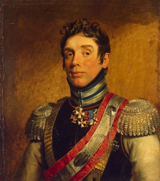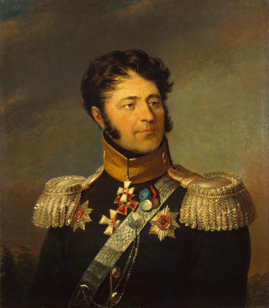 Editor: Here we have George Dawe's 1825 "Portrait of Baron Karl Clodt Von Jürgensburg, Russian General," rendered in oil paint. The overall impression is one of formal austerity, yet the general's gaze hints at a more complex inner life. What stands out to you? Curator: What I see here, beyond a formal portrait, is a snapshot of power structures in 19th-century Russia. Consider the social implications of Dawe, an Englishman, commissioned to paint portraits of Russian generals who had fought against Napoleon. Whose narratives are amplified and whose are silenced in this representation of history? Editor: That’s fascinating. I hadn’t thought about the artist's nationality influencing the piece in that way. So, are you suggesting the portrait may subtly reinforce a certain perspective on the war? Curator: Exactly. Think about the symbolism inherent in the military attire. What does it signify about class, privilege, and the roles available to men of this era? Who benefits from such imagery, and who is excluded? Dawe’s technique, rooted in Romanticism, idealizes the sitter, furthering the agenda of those in power. We must be critical of how these images shape our understanding of history and identity. Editor: So, by understanding the social context, we can move beyond admiring the artistic skill and actually analyze the portrait’s underlying messages about power. Curator: Precisely! It's not just about brushstrokes; it's about critically examining the narratives woven into the very fabric of the painting. Editor: That’s a totally new way to look at it. I appreciate you making me think about how historical context shapes our view. Curator: And I appreciate your fresh perspective and willingness to question established narratives.