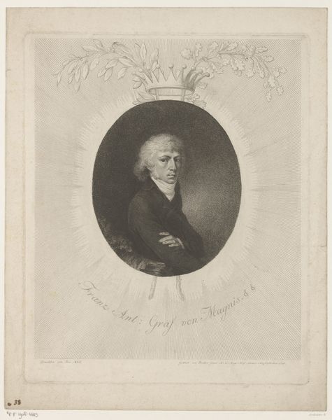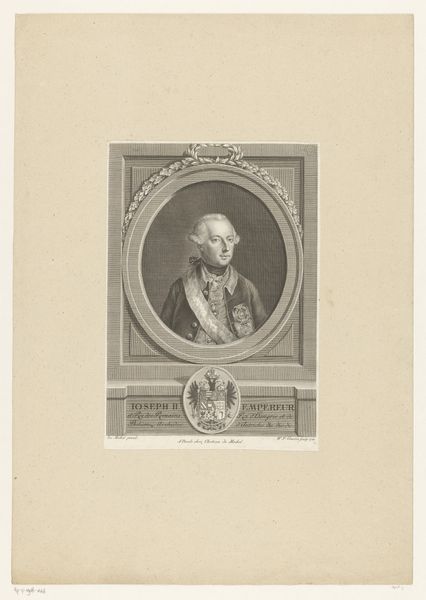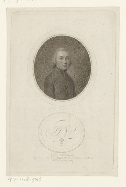Curator: Johann Josef Neidl's "Portret van Clemente Bondi," created sometime between 1786 and 1832, offers a fascinating glimpse into a particular era of portraiture. It's an engraving, a medium capable of incredible detail. Editor: The first thing that hits me is the contrast. The subject, enclosed in an oval frame of what appears to be... laurel? But beneath him, a swan, very cleanly rendered. Is there supposed to be a story there? It feels like two unrelated symbols awkwardly forced together. Curator: The combination certainly creates an interesting tension. Neidl worked within the Neoclassical movement, a style which harked back to the art of ancient Greece and Rome, hence the laurel wreath and idealized form. As for the swan, perhaps it's a reference to Bondi's own virtues – grace, purity, or maybe it simply reflects the patron’s aesthetic preferences. Who exactly Clemente Bondi was remains elusive, further deepening the image’s mystique. Editor: Well, someone certainly paid good money to have this engraving done, and that material transaction tells us a lot about art patronage at the time. We can consider that the paper, the ink, the craftsman’s labor involved – all these elements contribute to a commodity produced for a certain class. Was this portrait intended for wide circulation, perhaps as part of a book, or was it made for a private collection, do we know? The production of this image surely speaks volumes about material culture during this historical moment. Curator: That's a valid point. Engravings played a vital role in disseminating images and ideas during the period, before photography became widespread. Although often reproduced, they often carry subtle nuances. Look closely at the fine lines, the delicate shading Neidl employed to render Bondi's face – there’s a vulnerability that’s quite palpable despite the idealized presentation. There's something quite ghostly and transient about holding his gaze over centuries. Editor: Agreed, the skills involved in making this print shouldn't be underestimated, but for me, seeing it as one object amongst many highlights the socioeconomic frameworks around artistic creation. Ultimately, who could afford to make and display art? What types of material, subjects, and styles became popular because of these dynamics? These considerations shed light on more than artistic skills but about class and society. Curator: And understanding the "who" behind the "what" allows us a deeper appreciation of artistic expression! I enjoy stepping into the engraver’s mind, and envisioning their delicate, steady work. Thank you, Johann Josef Neidl for creating something enduring, not just of Clemente Bondi, but also this artistic record from so many years past. Editor: Definitely, it reminds me to appreciate art by questioning the status quo and recognizing the underlying processes. We hope you are just as enlightened as we are now!