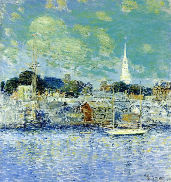 Editor: This is Jόzef Pankiewicz’s "Port of Concarneau," painted in 1908 with oil on canvas. The overall impression is quite dreamlike; it's soft and luminous. What particularly jumps out at you when you look at this piece? Curator: Ah, yes, a perfect sliver of impressionistic serenity! For me, it’s the light, of course. How it shimmers on the water, bouncing off those sleepy boats, giving everything a kind of liquid shimmer. Do you feel how Pankiewicz isn't just painting a scene but a feeling, a moment in time? It’s like capturing the essence of a sigh. Editor: Absolutely! It does feel very fleeting. Was Pankiewicz part of the French Impressionist movement then? Curator: He certainly spent time soaking in that Parisian atmosphere. He found his own way to use Impressionism, with his roots still in Poland, a certain… melancholy, perhaps? It feels like he is showing us beauty, and how fleeting and fragile it all is at the same time. What do you make of that buttery yellow on the buildings by the water? Editor: It's funny, it didn't strike me as melancholy at first – more joyful, perhaps, but now I see it, that almost hazy, longing feel to it. I think I was too caught up in the bright colours, like that splash of yellow. Curator: See how those colours play, each heightening the other’s effect? Colour against colour creates a whole mood. Maybe Pankiewicz is hinting, too, at his memories of the port city: nostalgia transformed to colours? Editor: It's fascinating how the technique can carry so much emotional weight. I definitely see more now than when I first looked at it! Curator: Me too! The fun’s in peeling back those initial impressions, isn’t it?