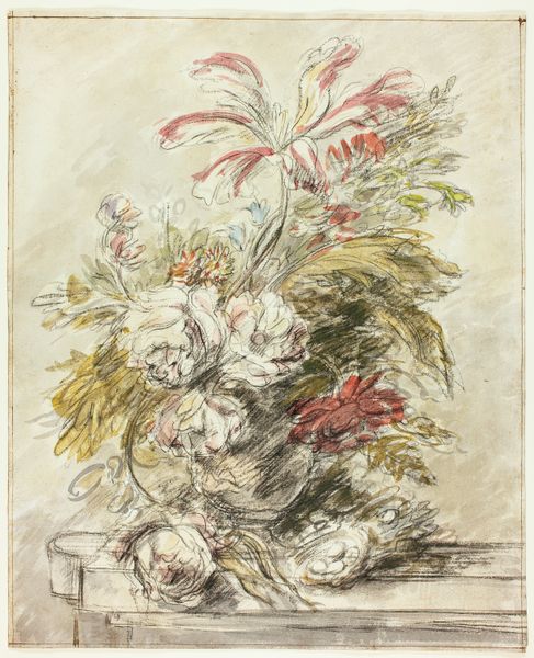 Curator: Before us is "Bouquet of Flowers in a Vase," a work attributed to Willem van Leen. This piece, residing here at the Städel Museum, appears to employ drawing techniques, combining pencil, chalk and tempera possibly along with elements of etching, demonstrating a command of various media for delicate rendering. Editor: It feels haunted, doesn't it? Like a floral arrangement from a forgotten parlor. The muted tones and delicate lines give it this ethereal, almost melancholic quality. It’s pretty, of course, but there’s a sadness lurking in those soft petals. Curator: The Romanticism style prevalent here uses the flower as an allegorical form, but perhaps in this case, its relation to a sort of social constraint imposed upon feminine presentation through decorous objects that sublimate women themselves, and the potential morbidity implied via ephemeral subjects is something that is also evident within broader European painting and design of this era. Editor: Absolutely. Flowers have always been symbolic stand-ins, haven't they? For love, loss, fragility…it feels like Van Leen’s really leaning into that fragility. The sketch-like quality enhances that sense of transience. You can almost feel them wilting as you look. Did everyone arrange their flowers to fade, knowing these memento mori overtones might trigger new meaning in daily life? Curator: Given the artist's possible exploration of various media, from chalk and pencil to even etching, we see a blurring of artistic processes which speaks to a moment of transition, in which the definition and accessibility of production expands beyond traditionally acceptable frameworks. The domestic sphere then plays an increasingly vital role in shaping the aesthetic landscapes, subtly questioning the hierarchy between "high" art and quotidian life, offering room for discourse. Editor: It’s almost as if you can sense the ghost of the hand that drew it all. I’d say it's beautiful in a poignant way. What really makes me think, looking at this, is how little the symbolic load of these simple domestic setups has changed. What would it mean to draw these now, I wonder? Curator: The themes of nature, gender, and class that are inherent within art are persistent. Editor: Food for thought!