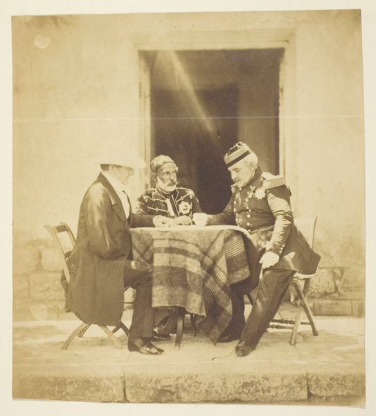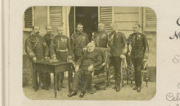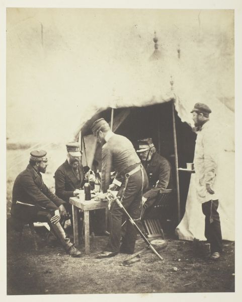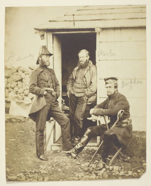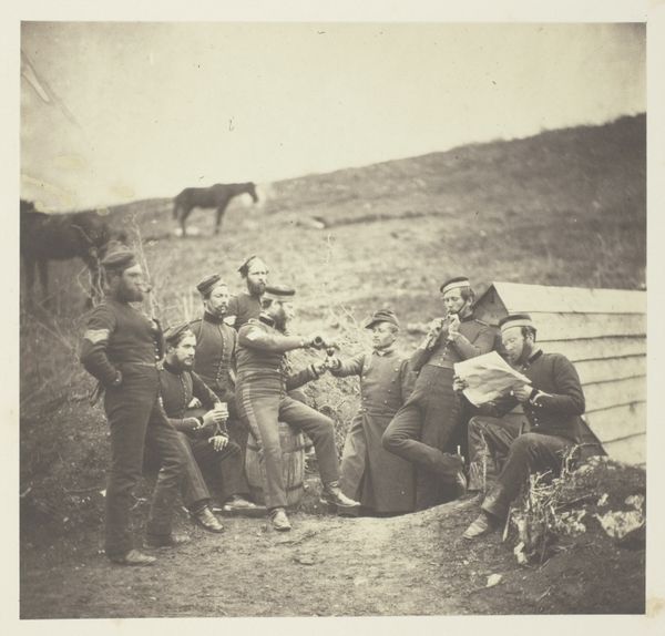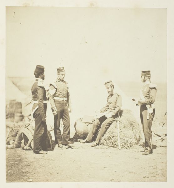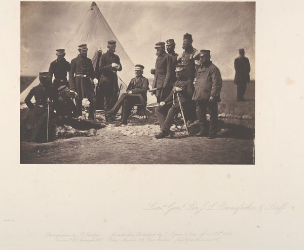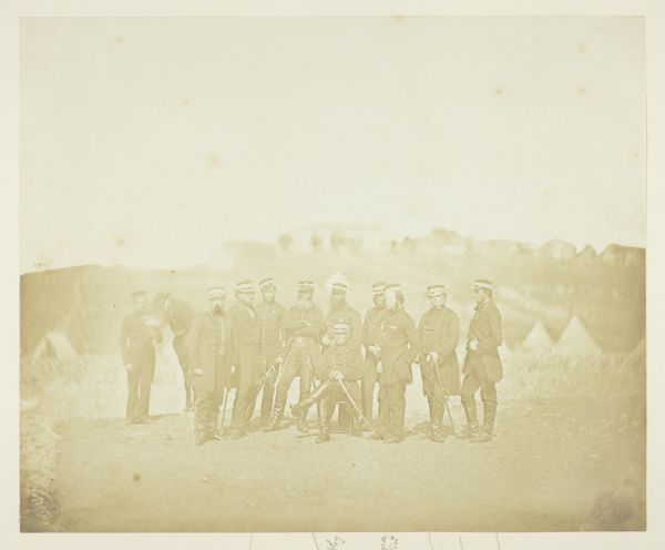 Roger Fenton captured this salt print, “Major General Estcourt and Staff,” presenting a compelling group portrait. The composition is carefully structured, with a cluster of figures arranged in relation to the architectural backdrop. Fenton emphasizes the geometric forms, creating a stage-like setting for the officers. The photograph operates within the semiotic discourse of military representation. Consider the significance of the swords, uniforms, and composed stances: these are all signs denoting power, authority, and order. Yet, there’s an element of tension between the formality of the portrait and the naturalness of the figures’ poses. Fenton's interplay between light and shadow not only adds depth but also serves a symbolic function. Notice how light falls unevenly across the scene, drawing attention to certain figures while obscuring others. This visual hierarchy reinforces the rank and status of those depicted, suggesting a nuanced commentary on power dynamics within the military structure. The interplay of light and shadow creates a dynamic and engaging visual experience.