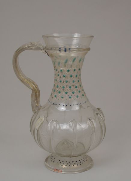 This stoppered cruet with a scroll handle, crafted by an anonymous artist, presents a fascinating study in form and function. The handle’s elegant scroll is more than mere ornamentation; it's a motif deeply rooted in the human psyche, a shape echoing the volutes of Ionic columns in ancient temples and the spiraling tendrils of burgeoning plant life. Consider how the scroll, as a symbol of continuity and unfolding, appears across cultures. From the manuscripts of medieval monks to the Baroque flourishes of 17th-century art, its presence speaks to a universal desire to express the dynamism of life itself. The very act of grasping the handle connects us to this primal urge. The glass, transparent and pure, hints at the alchemical fascination with transformation and the pursuit of clarity. As you behold this object, consider how its form transcends its utilitarian purpose, engaging us on a deeply emotional, almost subconscious level. It is a vessel not just for liquids, but for the transmission of cultural memory.