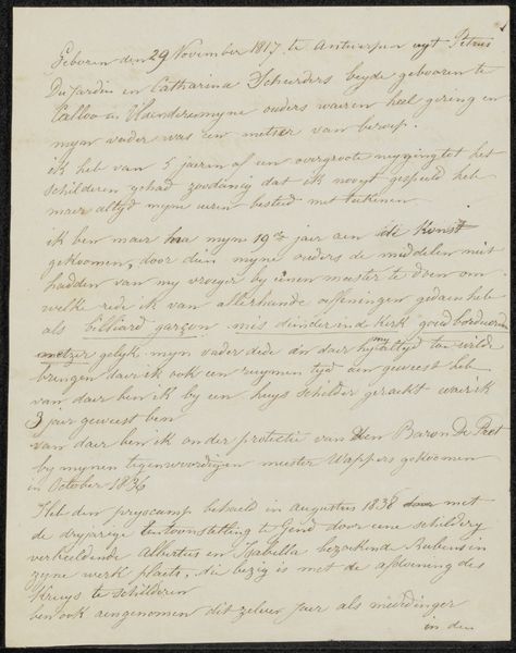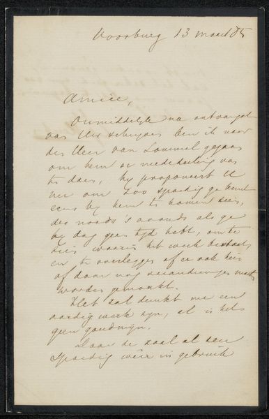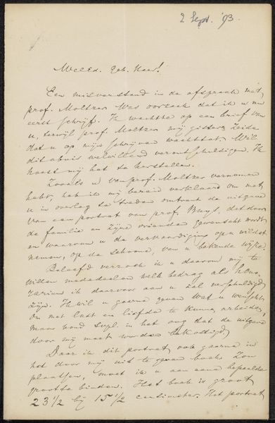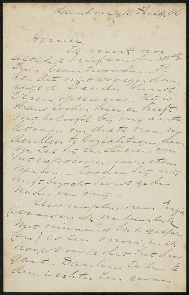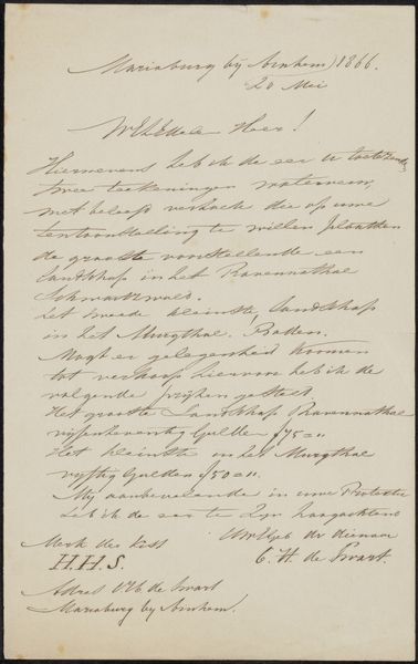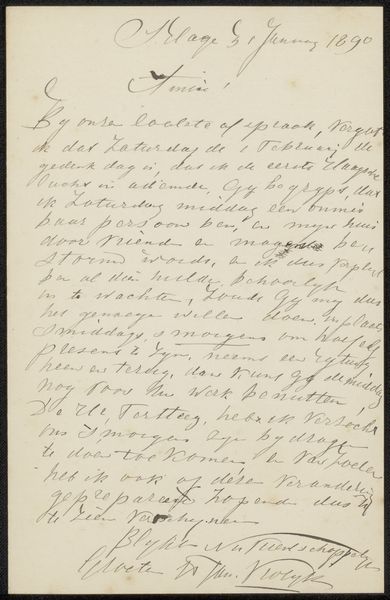 Editor: So, this is a drawing titled "Brief aan Jan Veth," potentially from 1890, created by M.C. Lebret using ink on paper. The calligraphy really stands out – it feels very personal, intimate even. What do you see in this piece, beyond just the visual? Curator: For me, this "Brief aan Jan Veth" provides a fascinating window into the cultural milieu of the late 19th century, especially when we think about the role of correspondence in intellectual exchange at the time. Letters were so important for forging communities, sharing ideas, and solidifying identities. How do you see this letter participating in those exchanges? Editor: Well, I guess it highlights how much intentionality went into communication. Today we dash off emails, but handwriting a letter, choosing the paper and ink, shows a different level of care. It makes you wonder about the relationship between Lebret and Jan Veth. Curator: Exactly. We can infer a certain level of intimacy and intellectual rapport. Also, considering the rising tide of modernism, how did such intimate exchanges, like this letter, create networks of solidarity among artists and intellectuals facing monumental shifts in artistic and social norms? The seemingly mundane object actually acted as a bulwark, did it not? Editor: That's a perspective I hadn't considered. The letter as an act of resistance, a holding-on. Curator: Precisely. And remember that each line is laden with the historical conditions of its writing, embodying specific cultural tensions and perhaps also individual or community aspirations. What did we learn looking beyond the aesthetic appeal of calligraphy into social networks that created such artefacts? Editor: I'll definitely look at letters in a different way going forward! The personal becomes political through connection and community. Curator: Indeed. The letter transforms from a simple message to a valuable witness of a historic moment.