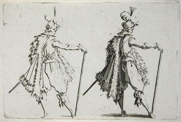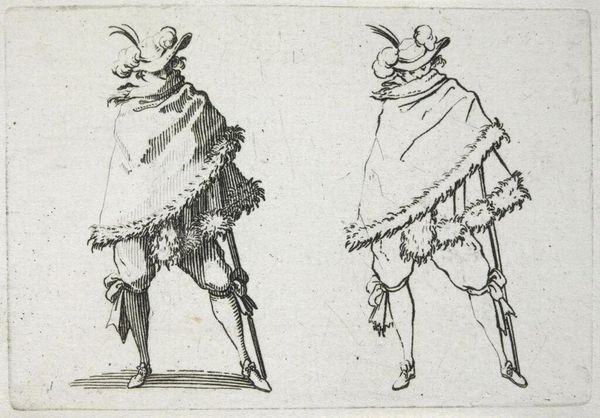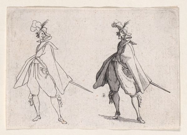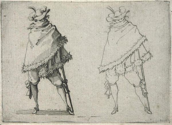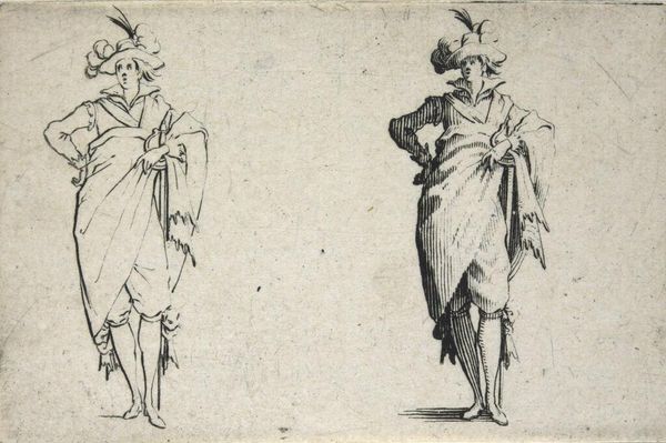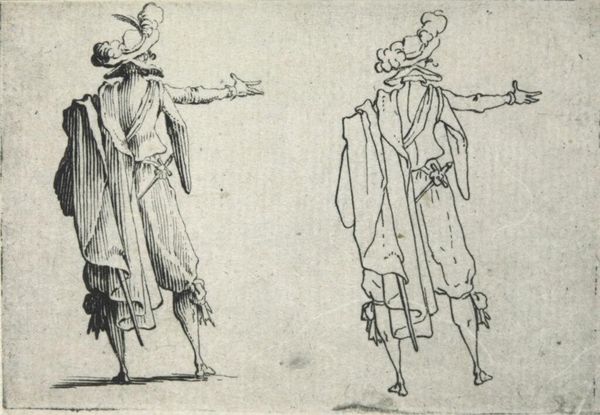 Editor: So, here we have "Gentleman with a Large Cloak, Seen from the Back," by Jacques Callot. It’s a delicate etching, quite small. I’m struck by how much personality Callot conveys, even though we only see their backs! What do you make of it? Curator: It's a study in swagger, isn't it? Callot captures a mood, a time, a societal expectation, all in a few lines. Look at the detail in the cloak versus the implied simplicity of the face. It’s all about presentation, performance. It makes me wonder what story each gentleman carries. Editor: That's a great point about performance! Now I'm seeing them as characters on a stage, not just figures in a drawing. Curator: Exactly! Art often holds up a mirror, reflecting not just what is, but what we aspire to be. And sometimes, what we fear. It’s all in the cloak, darling!