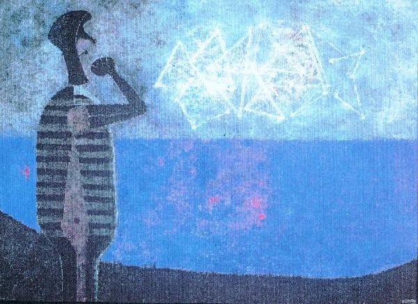 Editor: This is "Captive" by Nicholas Roerich, created in 1943 using watercolors. There's this striking simplicity to it, but also a sense of isolation, almost like a single scene from a larger myth. What stands out to you about this piece? Curator: Myth indeed, perhaps a lost chapter! Immediately, I am struck by the intentional "naivete" of Roerich's style. The colours bleed like old tapestries, hinting at distant lands and forgotten stories. Does her stance suggest captive of body, or mind, do you think? Editor: Hmm, that’s interesting… I hadn't considered it that way. Maybe she’s both, trapped physically but also mentally preoccupied. Is the landscape important here? Curator: Hugely so! Roerich uses landscape as a character itself, witness and container of human drama. The washes of fiery sunset suggest a passion or conflict that our Captive reflects in miniature. Do you see a conflict within the woman too, perhaps in her downcast eyes? Editor: I do now! The colours also give off warmth and danger at the same time. Are there any other details that amplify her emotional state? Curator: Observe her garments, and those seemingly deliberate lines – simplified to near abstraction – on her clothes that may signal a uniform? A life unlived! The hands are touching but not comforting – like she yearns to cradle something. Or someone. Does the piece resonate any differently now for you? Editor: Definitely. It feels much more complex now, seeing her as a figure within a landscape of inner turmoil, and it's interesting to note Roerich using 'naive' style to make it so accessible. Curator: Indeed. That initial simplicity is a doorway. A masterful invitation. A mirror for our own interpretations to bloom in!