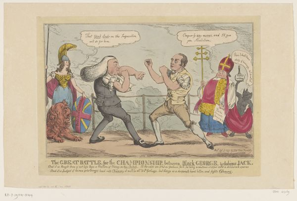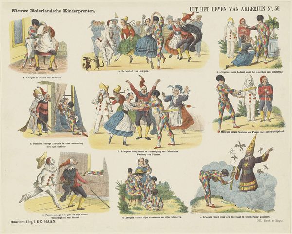 Editor: Here we have “Characters, from Jack and the Giant Killer, Plate 8 for a Toy Theater” created between 1870 and 1890 by Benjamin Pollock. It’s a lithograph print that feels playful, almost like a storyboard. What jumps out at you? Curator: I am drawn to the composition. Observe how Pollock arranges the figures—each a self-contained unit, yet contributing to a unified whole through carefully balanced shapes and color. Note, particularly, the strategic use of repetition in the characters' poses and costumes, a visual rhythm that guides the eye across the artwork's surface. Editor: The repetition definitely makes it easy to follow. What about the colors? I notice they're quite vibrant despite the print's age. Curator: Indeed. The colors, while seemingly simple, function as a sophisticated structural element. The contrast between the predominantly cool blues and reds, punctuated by yellows, establishes visual hierarchies, distinguishing central figures from those in the background. Editor: That’s fascinating. It's amazing how much analysis can be drawn just from the composition and colors themselves! Are there other formal relationships here worth noting? Curator: Absolutely. Consider the interplay of line and shape. The precise delineation of each character creates a distinct sense of form. Furthermore, consider how the figures relate spatially within the flat plane of the lithograph. Notice the carefully controlled overlapping and juxtapositions of the figures against the ground plane. The image possesses remarkable depth despite its surface flatness. Editor: This has provided an entirely new way to appreciate Pollock’s print, seeing how all of these elements are related. Thank you for sharing! Curator: You are most welcome.