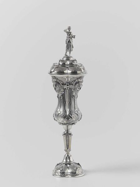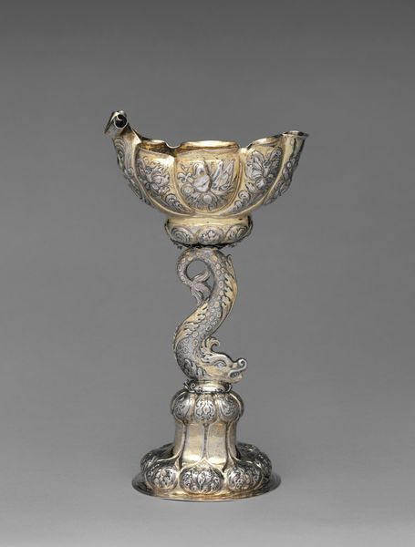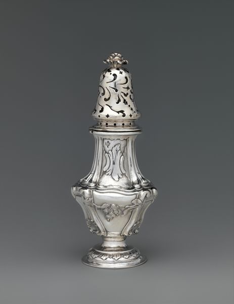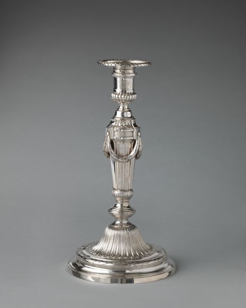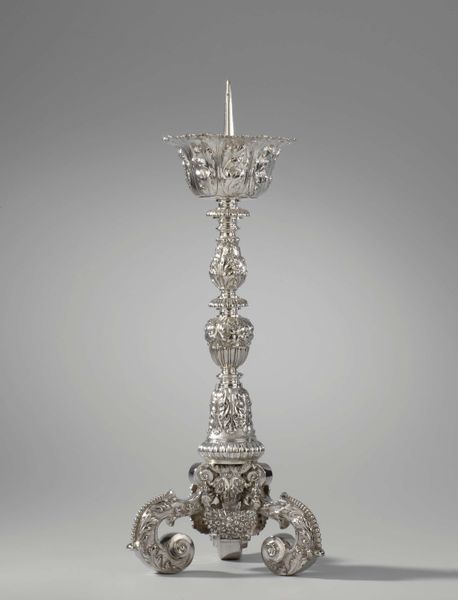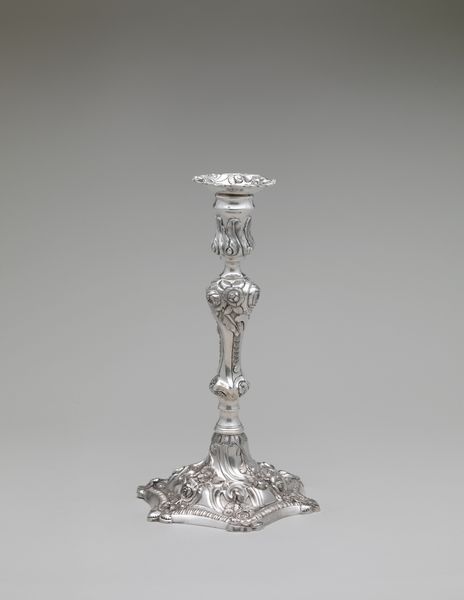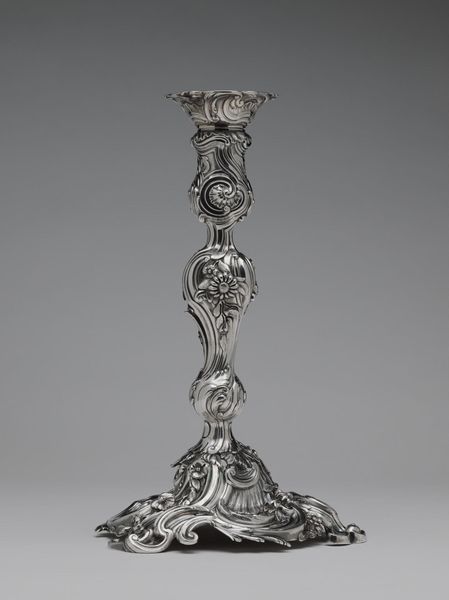 Curator: This elaborate silver candlestick was crafted by George Wickes, who lived from 1698 to 1761. It resides here at the Harvard Art Museums as one of a pair. Editor: It’s beautiful, but all that swirling ornamentation feels… excessive, almost oppressive. Curator: The floral motifs and sinuous lines embody the Rococo style. Silverware, particularly candlesticks, were signifiers of wealth and status. The flame it holds transforms a domestic space into a sacred or ceremonial one. Editor: I wonder about the labor conditions. Were the artisans of the time fairly compensated, or were they exploited to create this object for the wealthy elite? Curator: Silver, with its reflective surface, has long been associated with the moon and feminine energy. Candlesticks like these would have illuminated social gatherings, private moments, and spaces of great importance. Editor: And while it projects status, it also silently speaks to the inequalities inherent in a society where such opulence exists alongside poverty. It reflects both light and shadow.