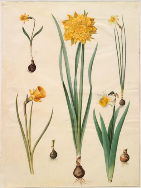 Curator: This artwork presents three narcissus variations by Hans Simon Holtzbecker, completed sometime between 1649 and 1659. He employs watercolor and gouache on paper. It is entitled "Narcissus tazetta, Narcissus X medioluteus, and Narcissus bulbocodium." What do you make of it? Editor: Initially, the image reads like a botanical study. The artist really captures the quiet, methodical nature of observing and recording. Curator: Indeed, the use of gouache and watercolor on paper enables very fine, translucent layering, facilitating detailed botanical illustration that was particularly appreciated during the Renaissance. Considering the social context, botanical illustration supported emerging sciences and international trade and commerce that dealt with raw materials. Editor: The flat presentation almost suppresses any illusionism; all attention goes to observing details—look at the bulbs with the tiny root hairs reproduced so precisely! There’s also the stark whiteness of the flowers contrasting against the colored stamens. It all speaks to a structured approach to viewing nature. Curator: I would emphasize, too, how the handmade quality enhances the relationship between art and craft, as these were skills required in mercantile environments. Do we view such illustrations simply as scientifically motivated pieces, or might these reflect broader humanist beliefs? What materials would be available to Holtzbecker and the possible patrons? Editor: Interesting questions! I wonder, given that it is Northern Renaissance, whether the textures suggest emerging trade in specialized papers, new pigments…it evokes a sensory appeal through meticulous execution. Yet the naive depiction evokes qualities that transcend mere recording. Curator: That interplay of functionality, skilled craftsmanship, and material constraints seems pivotal. Editor: Agreed. Considering those details further refines and elevates this botanical image beyond pure utility to become its own experience in viewing. It prompts us to consider observation and visual pleasure in the same viewing act.