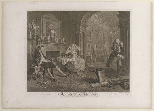 Editor: This engraving, "After" by William Hogarth, made in 1736, depicts what appears to be the aftermath of a night of passion. It seems rather chaotic. A woman clutches at the man, a wigged figure stands in the background… what's the story here? How do you interpret this work? Curator: Hogarth's series, "A Rake's Progress" critiques the social mores of 18th-century England, and we can see that playing out here. Consider the purpose of the print medium in that era: reproduction enabled Hogarth to disseminate his social critiques widely. Where do you see that critique manifesting visually? Editor: Well, the overturned table, the discarded clothing... It's a rather unflattering portrayal of aristocratic excess. There’s even a dog gnawing on something! Curator: Exactly. Hogarth uses these details to underscore the moral decay he perceived within the upper classes. Notice also the composition - the claustrophobic space, the figure lurking behind a curtain. It all speaks to a world of secrets and hypocrisy. It raises questions about social mobility. Editor: The hidden figure is unsettling. Is that the man's wife or a member of the aristocracy? Curator: It could be both. It speaks to power dynamics and social hierarchies that the wealthy men of the era are afforded in the public sphere. This piece reminds us of the art market's development during that time, especially the popularity of satirical prints among a burgeoning middle class. Did anything catch your eye that we didn’t discuss? Editor: Thinking about it as social commentary makes me see even more in it – thank you! The role of art as a mirror to society becomes clearer. Curator: Indeed, and it reveals how the narrative becomes the social currency of cultural production.