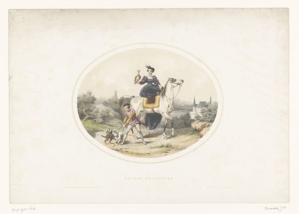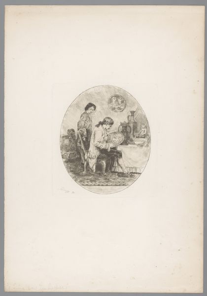 Alexandre-Gabriel Decamps created this lithograph in the 19th century. It presents a scene of Italian peasants, reflecting the Orientalist fascination prevalent in European art at the time. Decamps, like many of his contemporaries, was interested in depicting cultures that were seen as 'exotic.' This interest often came with an imposition of European perspectives, shaping how these cultures were viewed and represented. The lithograph shows a woman in traditional garb offering something to a group of men. Her image and dress are likely romanticized, which obscures the realities of peasant life. These depictions tell us more about the European gaze and its desire for the picturesque than about the Italian people themselves. Works like this invite us to consider how cultural exchange can sometimes reinforce stereotypes and power imbalances.