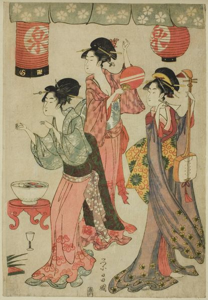 Chōbunsai Eishi created this woodblock print, "Women Viewing Cherry Blossoms", now at the Art Institute of Chicago, using delicate lines and subdued colours. The composition centres on the elegant figures of women, with their ornate kimonos dominating the visual field. The fabric drapes and flows around them, creating a sense of movement, while the accessories add texture and depth. The arrangement of the figures, combined with the flat perspective typical of ukiyo-e prints, results in a complex interplay between foreground and background. The semiotic structure of this print lies in the cultural codes associated with cherry blossoms, symbols of transience and beauty in Japanese culture. The women’s elaborate attire and leisurely activity suggest a world of refined aesthetics and social ritual. Through its formal elements and careful composition, the print destabilizes the conventional representation of space and depth, inviting us to reconsider our understanding of aesthetic value and cultural meaning. The intricate patterns and muted tones emphasize the artificiality of the scene and subtly challenge the perception of reality.
