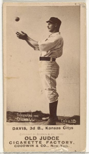 Curator: Before us, we have a trade card produced in 1889 by Goodwin & Company, titled "William Franklin 'Bill' Hart, Pitcher, Des Moines Prohibitionists, from the Old Judge series (N172) for Old Judge Cigarettes," a photographic print from a drawing. Editor: Gosh, look at the way he is posed and so white! Something very ghostly and frozen about it all. Feels like a relic, unearthed. Like an advertisement for a brand, that only existed in the nineteenth century, you know. Curator: These cards were inserted into cigarette packs, not unlike baseball cards today, though with the added complexity that cigarettes were consumed very differently across social strata, creating uneven markets around visibility and aspiration. It also evokes the social dynamics tied to the history of temperance movements. Editor: Oh, really? The Des Moines Prohibitionists part makes total sense! And those tall, dark socks are kinda stylish, even by today's standards. They ground him a bit amidst all the pale. Curator: The fact that it’s printed in monochrome heightens this sense of the past and highlights how sporting figures were presented and consumed as nascent celebrities. Goodwin & Company weren't just selling baseball players, they were marketing a lifestyle, ideas of masculine identity in late nineteenth century America and how commodities entered the cultural production through photographical representation of famous sportsman as the ideal American hero. Editor: It’s strange. This image makes me reflect on how even a mundane thing like baseball became tied to capitalism and advertisement. Think about how athletes have come to endorse all sort of products today... nothing is sacred, eh? Curator: These cards speak volumes about advertising strategies, celebrity culture, and even the socio-political landscape of the late 1800s, marking a transition to commodified leisure. Editor: In the end, all you're left with is a ghostly echo from the 1880s. Curator: Yes, but an echo that carries echoes of power, identity, and representation across the ages.