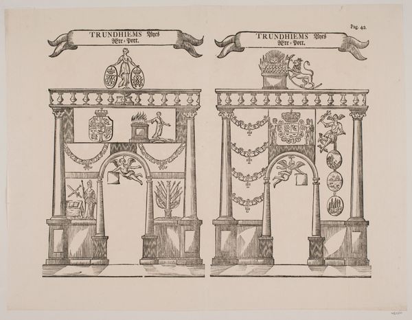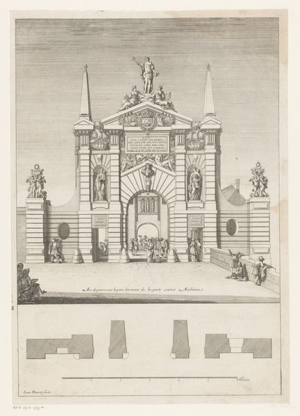 Curator: At first glance, this etching projects an interesting starkness. Its precision is striking, wouldn't you agree? Editor: Indeed. The use of line is remarkable. The precision is appealing in the rendering of this Haarlemmerpoort design. Curator: This piece, attributed to an anonymous Dutch Golden Age artist from 1631, exemplifies the Dutch Republic’s civic pride through its detailed architectural studies. Note the prominence given to what likely was a very public structure. Editor: The composition is primarily linear; its meticulous detail doesn't seem to let texture emerge naturally through tonality or shading techniques. Is there something more to say? Curator: I’d say so! As the physical gateway into Haarlem, it’s worth thinking about the historical role of city gates as sites of trade, governance, and defense. This print gives prominence to all of those symbolic aspects through that impressive ornamentation. Editor: Function certainly blends into ornamental forms, the lion heads above giving me a clue of that symbolism. Its geometrical forms create strong order and hierarchy but do those stone faces give off a stern feel to you as they do to me? Curator: They're standard fare for Baroque architecture, though! If you study these gates you will notice a conscious attempt to awe any passerby, reminding them of the power structures they're entering into. It speaks to the aspirations of urban planning at that moment, to impose authority through architectural presence. Editor: So its effect relies both on inherent properties like balance and scale but also relies on societal context? If its primary goal was to impress those traveling to or from Haarlem, do you think it fulfilled its original role successfully? Curator: The number of these prints being actively made shows an appreciation, or desire at the very least, to associate oneself with the architecture, or perhaps show one's loyalty to the city of Haarlem, a vital urban center then as now. Editor: Seeing such an analytical rendering definitely invites careful study. Thank you for drawing attention to these many different points! Curator: Thank you as well. It’s these small, carefully-wrought prints that really bring the past alive!