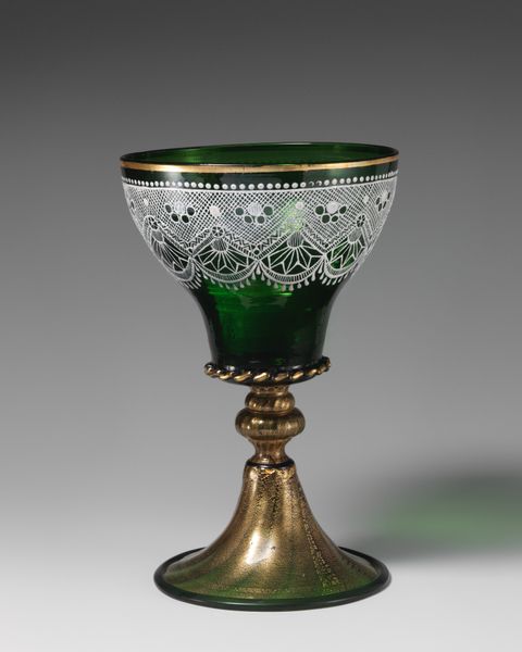 This enameled goblet was fashioned by Émile Gallé, a master of French glass artistry. Notice how the golden crosses encircle the rim, drawing the eye to the vessel's opening. The cross motif is far from new. It has appeared in various forms across cultures, from ancient solar symbols to heraldic emblems of power. Here, the stylized crosses, rendered in lustrous enamel, may evoke a sense of tradition and spirituality. The blue crosses, interspersed with palmette patterns, create a dance of order and fluidity, perhaps reflecting the complex interplay between faith and nature. Observe how the palmettes, reminiscent of ancient Egyptian and Greek designs, flank the crosses. What do they tell us? As these age-old emblems intertwine, they spark a dialogue between epochs, weaving a rich tapestry of cultural memory. This goblet is not merely a drinking vessel; it is a vessel of symbols, resonating with echoes of the past.