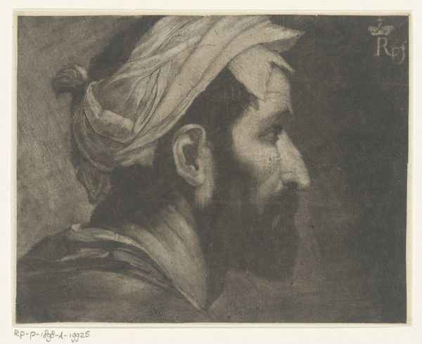Curator: Richard Houston’s 1755 engraving, "Head of Executioner, from John Evelyn's Sculptura," immediately strikes me with its somber and rather contemplative mood, wouldn't you agree? The subject’s gaze, directed away, hints at an internal world we can only speculate about. Editor: Absolutely. There’s a weightiness to the image—the darkness closing in around the face and the intricate folds of his turban contribute to a sense of contained power and, dare I say, reluctant authority. Who are executioners within the social and political discourse? It’s complex. Curator: Indeed, executioners historically occupy a liminal space in society—agents of state power yet simultaneously ostracized and often reviled. Consider how that role intersects with prevailing class structures and access to power at the time. Houston presents this individual as worthy of, perhaps even demanding, a form of dignified regard, don’t you think? Editor: It's a fascinating tension. Notice the specific type of turban and dress; does that have roots in Ottoman iconographies of power? Even the way his beard is shaped evokes certain visual tropes associated with authority. He’s positioned visually, to embody the figure of 'executioner', through symbols the culture immediately associates with 'power', so Houston invites the viewer to decode those associations and assumptions. Curator: I agree. He certainly understood how attire communicates. What's really powerful is how Houston subtly invites empathy. Look at the careful rendering of the facial features, how it steers clear of caricature or demonization, aligning itself to the cultural perception that he could simply be someone just doing a job. This is not to negate the role the executioner plays within systematic state sanctioned murder, but rather, the ability for propaganda to shift popular support depending on presentation. Editor: I hadn’t thought of it in precisely those terms, but it’s true, there's a restraint to the artwork—almost an unsettling neutrality. The composition directs our eyes straight toward that powerful profile. So, whether through this engraving we confront the role this person may play, we are made aware, on some level, that he may carry out a brutal function for a higher, pre-approved goal, that allows state violence to be enacted. Curator: I’m struck by how contemplating "Head of Executioner, from John Evelyn's Sculptura," allows us to consider the function and representation of such complex roles and figures across history and cultures. Editor: It offers, through a seemingly simple portrait, so many avenues into broader historical, cultural, and psychological landscapes. And with its powerful use of visual symbolism, that executioner haunts us even now.