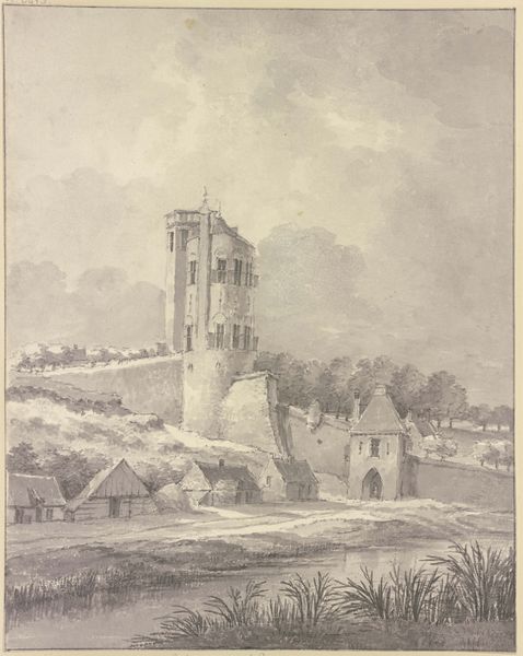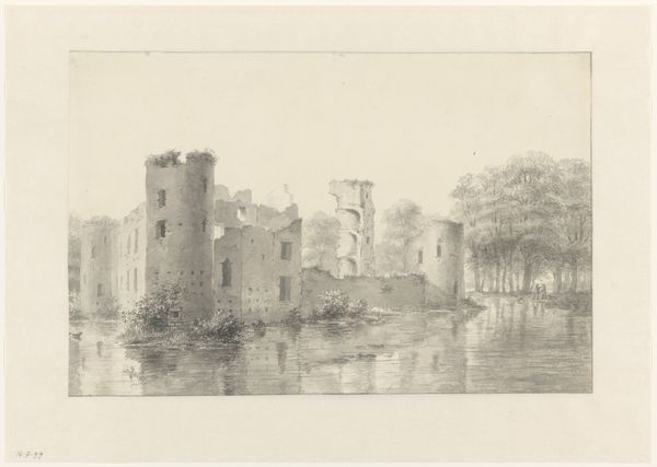 Editor: This is Jacob Esselens' "Ruine von Schloss Honingen in Kralingen bei Rotterdam," done in ink and pen on paper. The decay in the architecture really creates a somber, reflective atmosphere. What stands out to you when you look at this piece? Curator: The somber mood you perceive is carefully constructed. Note how the artist uses varying densities of lines to render the ruin and its reflection. The precise rendering of the reflection adds a level of formal complexity, almost doubling the subject while simultaneously abstracting it. Editor: I see what you mean! It's not just a straight mirror image. The lines in the water feel much more chaotic compared to those outlining the castle itself. Curator: Exactly. The controlled lines in the architectural rendering, set against the looser, more gestural strokes in the water, create a powerful tension. It encourages a dialogue between order and disorder, permanence and decay, mirroring life itself. Observe, too, the subtle tonal gradations; they lead the eye through the composition. Editor: So the artist isn’t just depicting a ruin; they’re making a visual argument about the nature of change and time? Curator: Precisely! Esselens’ work is deeply involved with questions of representation and abstraction. One must appreciate not only the subject, but how its meticulous depiction evokes fundamental themes. Editor: That makes me look at it differently now. I was stuck on the 'ruin' aspect but focusing on the formal relationships changes the whole meaning. Curator: Indeed. Art allows us to deconstruct and analyze inherent pictorial strategies; what we initially saw as a bleak illustration is a meticulously composed meditation on time.